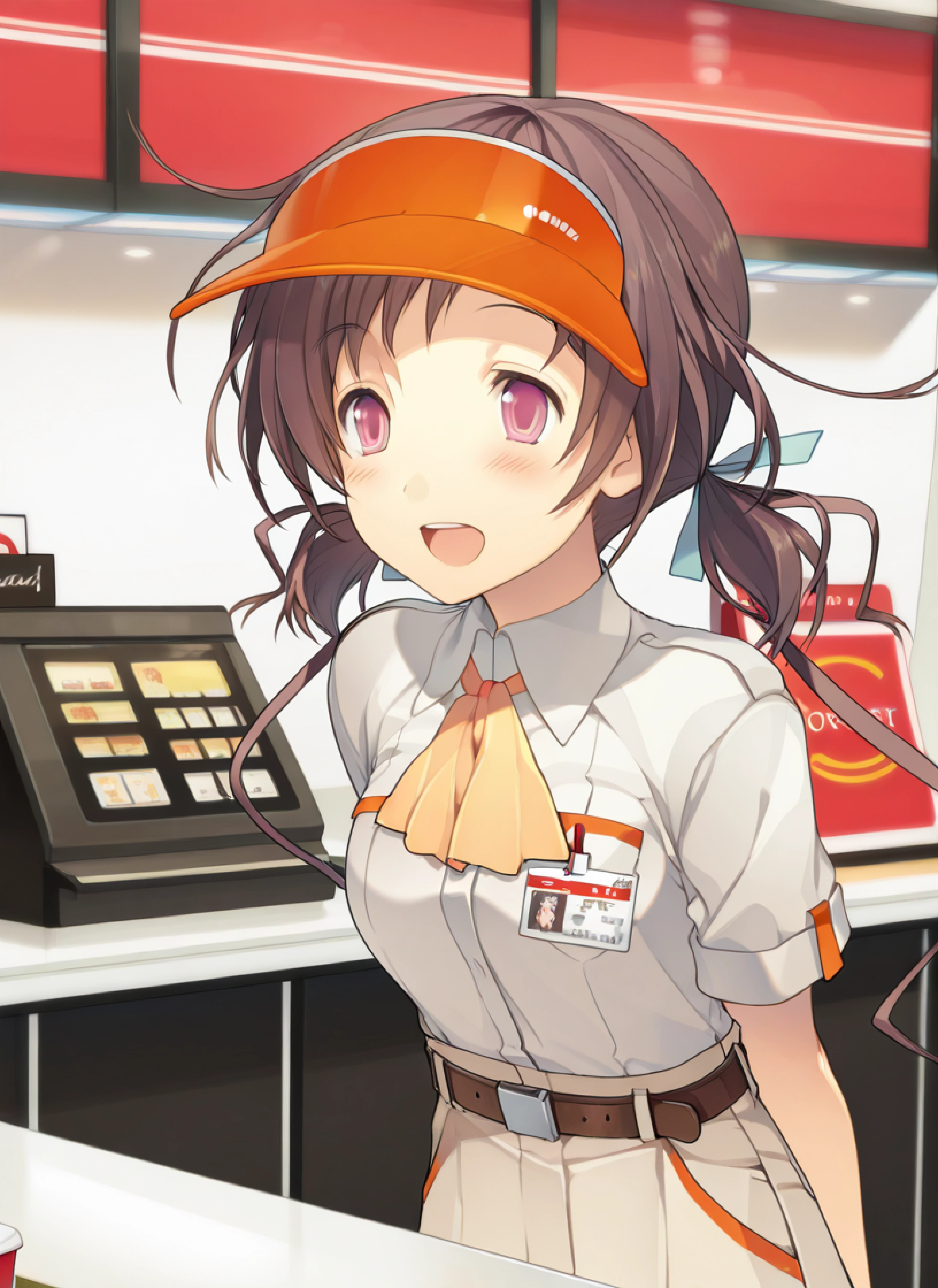 work uniform, orange visor, gray collared shirt, short sleeves, yellow neckerchief, orange trim, brown belt, silver belt buckle, employee name card, tan skirt