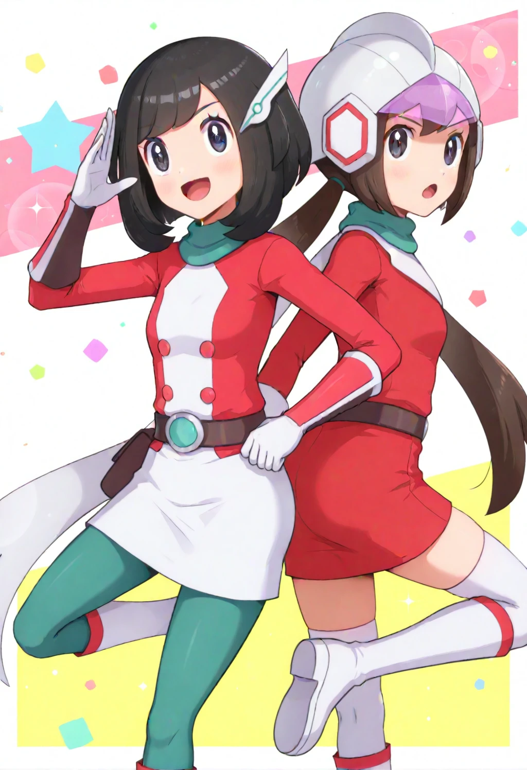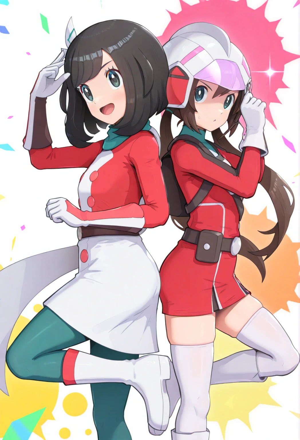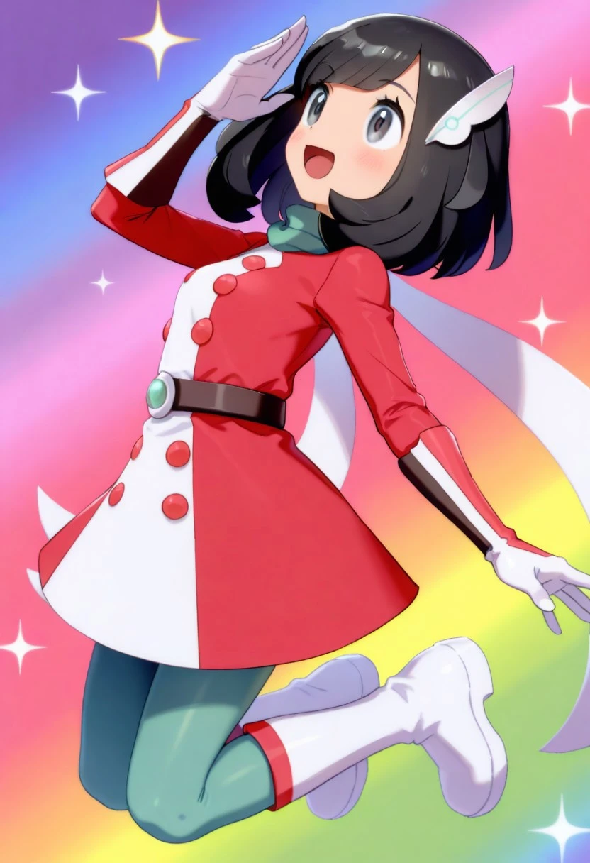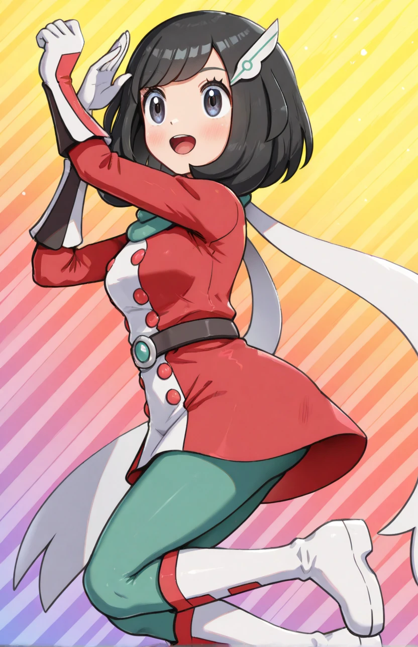 hair ornament, scarf, two-tone dress, white dress, red dress, buttons, long sleeves, belt, multicolored gloves, white gloves, red gloves, black gloves, green pantyhose, knee boots, white footwear