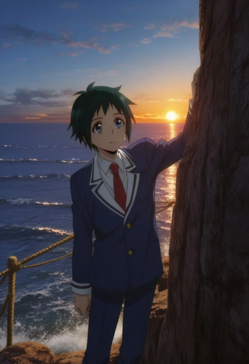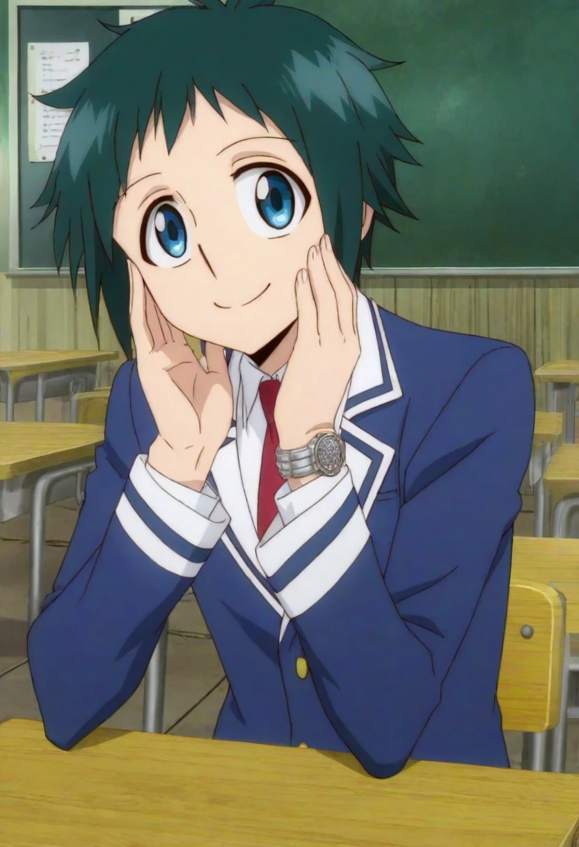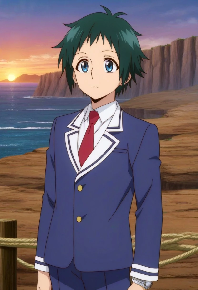 Nanao Nakajima, dark green hair, blue eyes, blue blazer, white accents, white collared undershirt, red necktie, left silver wristwatch, blue pants