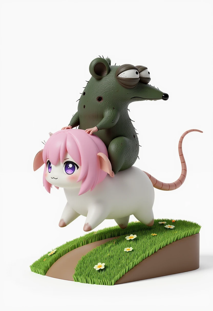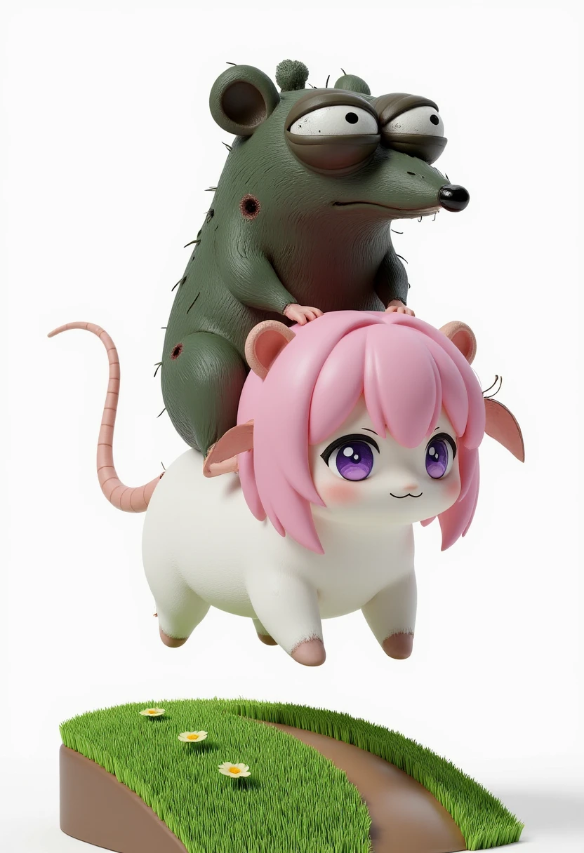 Odd-companions-v2 a white background with a female mythical creature with pink hair and a mouse on top of her, surrounded by grass and flowers.