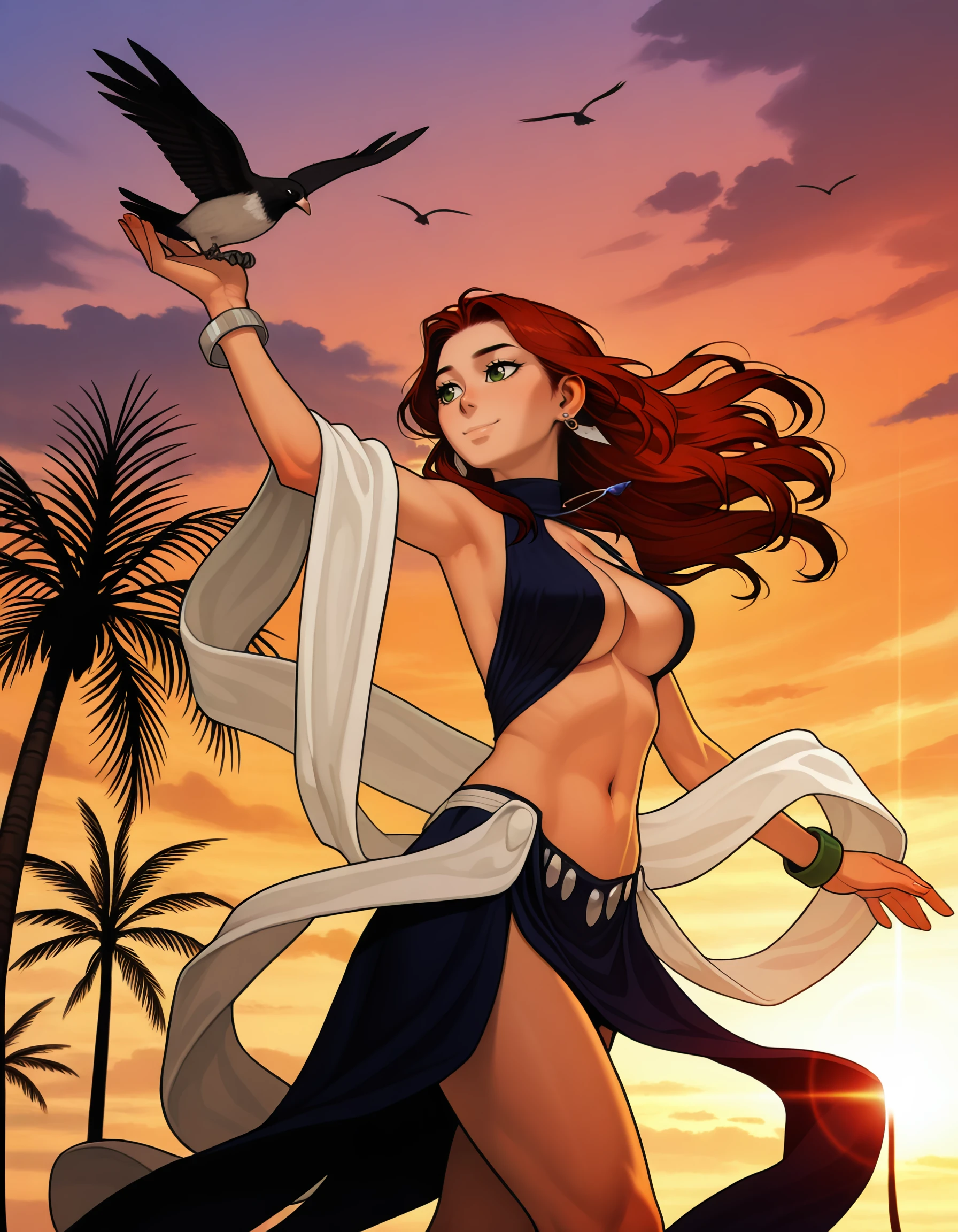 • large_breasts, cleavage, navel, midriff, bare_shoulders, dress, shawl