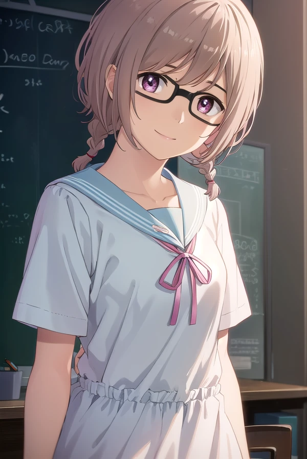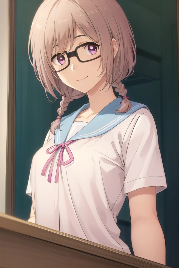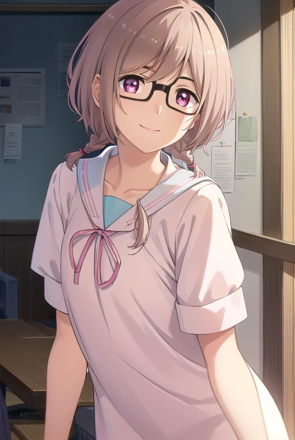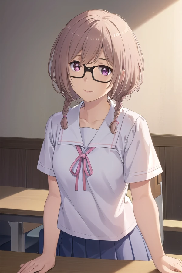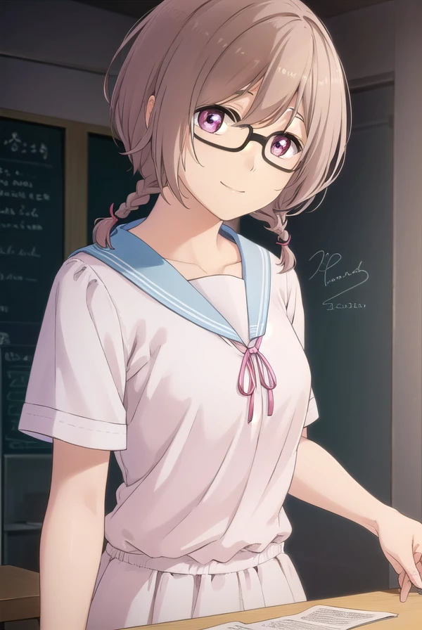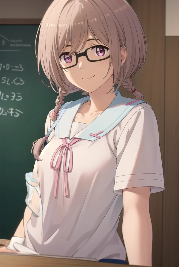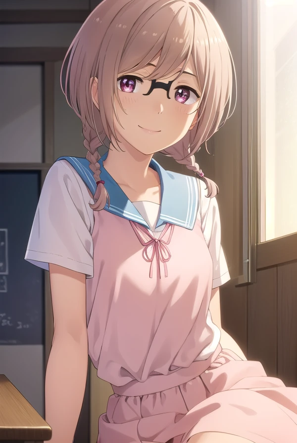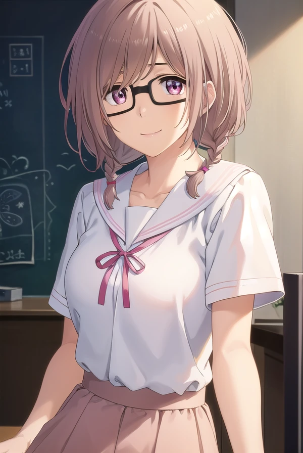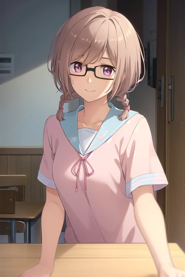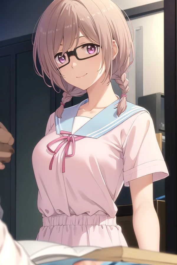 an onoya, brown hair, (pink eyes:1.3), braid, twin braids, glasses,