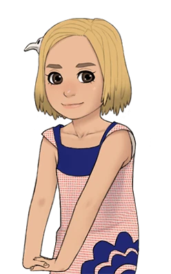 pink sleeveless dress, blue neckline, Maja, 1 girl, alone, short straight blonde hair, brown eyes, thin, ankle socks, purple sneakers, hair ornament