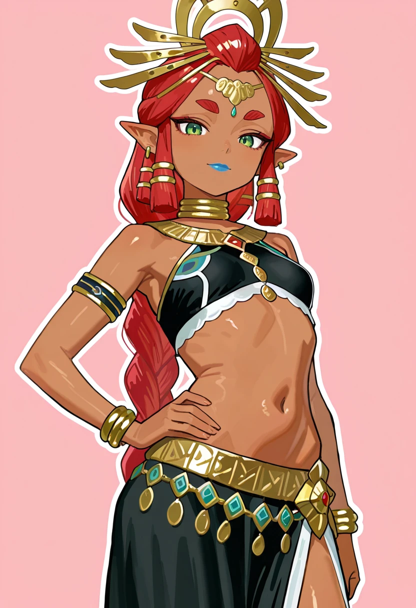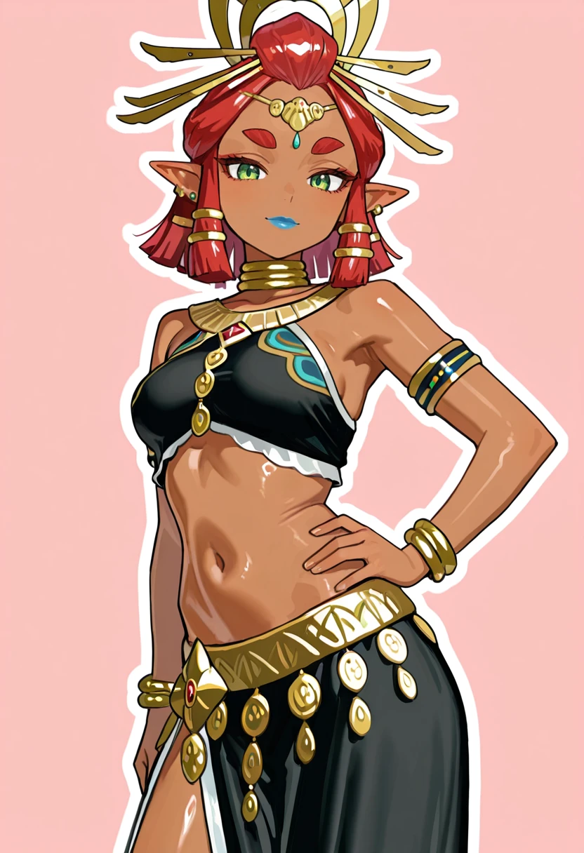 r1j0, dark-skinned female, blue lips, red hair, pointy ears, green eyes, hair ornament, thick eyebrows, earrings, long hair,