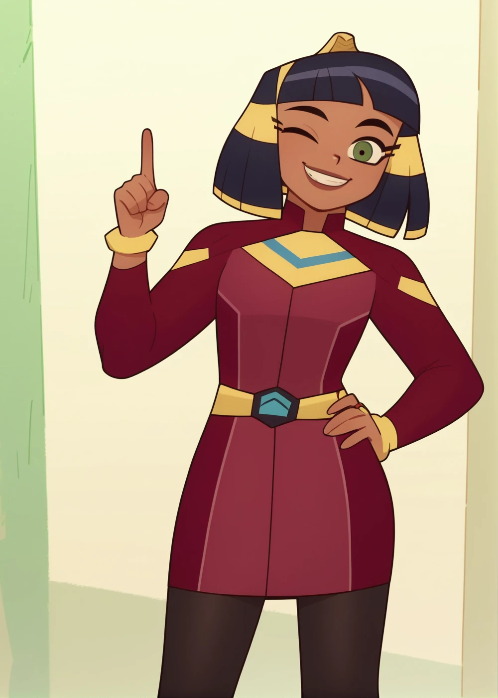 red dress, high collar, long sleeves, bracelet, belt, black pantyhose, red boots
