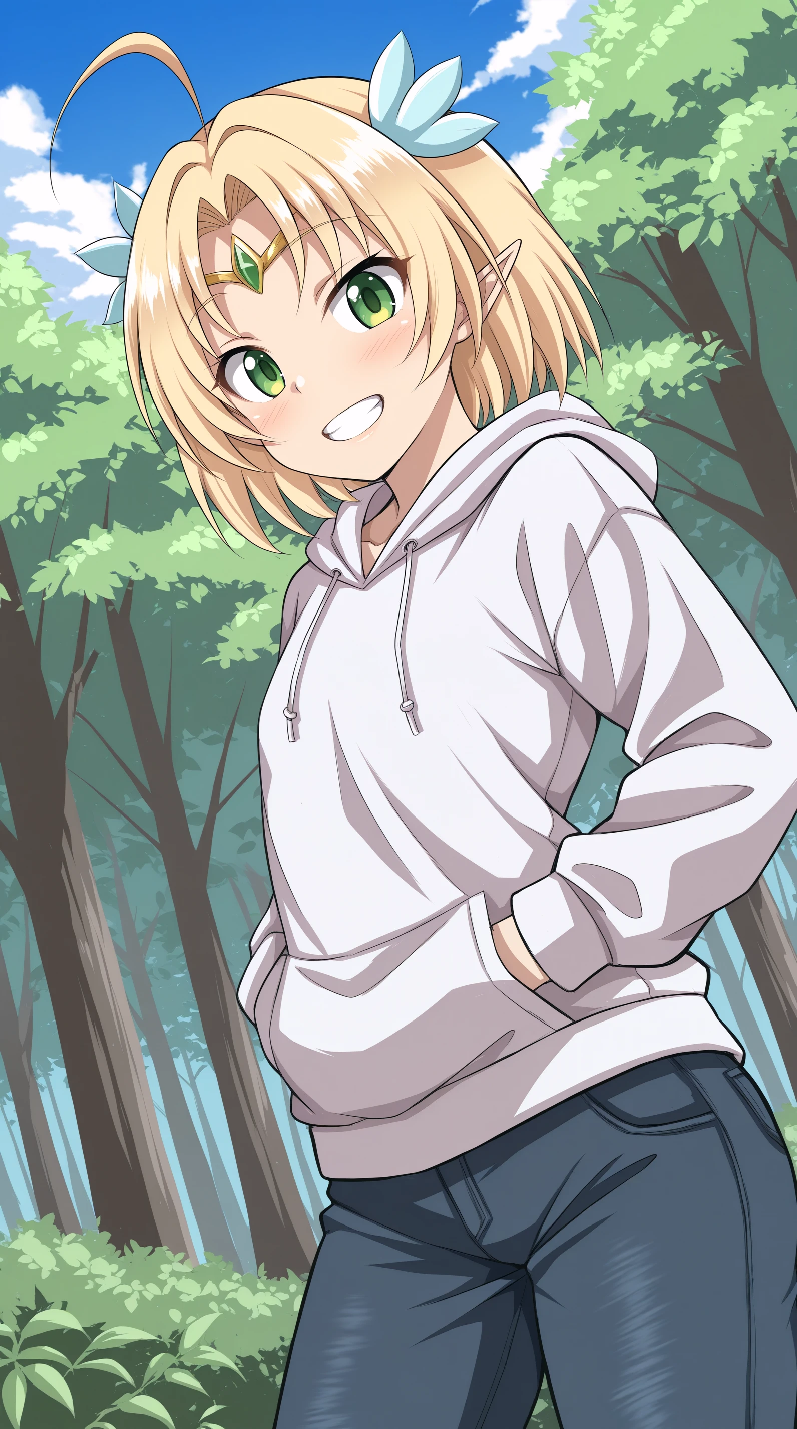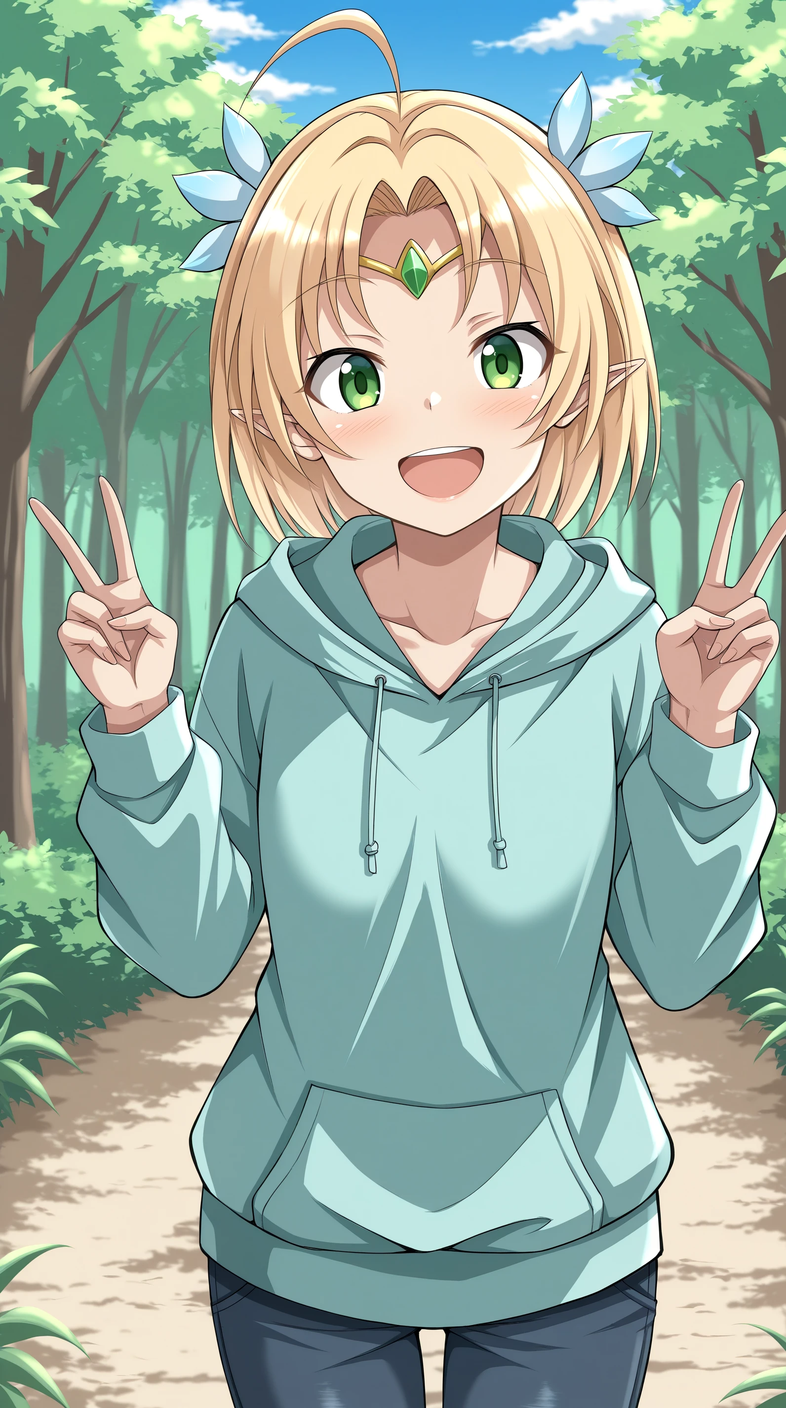 green eyes, blonde hair, short hair, ahoge, hair ornament, circlet, pointy ears