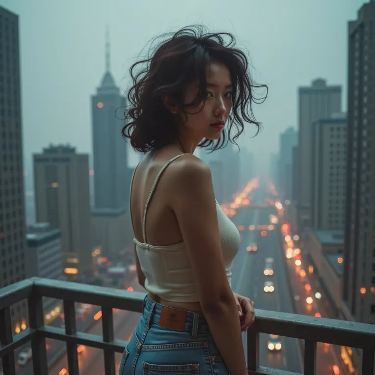 CTAI. A pensive, alluring woman gazes pensively out of a window, her expressive face bathed in soft, warm lighting. Her dark, wavy hair frames her delicate features, accentuating her captivating eyes and pout. She wears a floral, spaghetti-strap top that complements her naturally beautiful appearance. The window behind her reveals a blurred, atmospheric background, keeping the focus solely on the subject's introspective expression. The overall mood of the image is one of subtle sensuality and introspection, inviting the viewer to ponder the subject's thoughts and emotions.