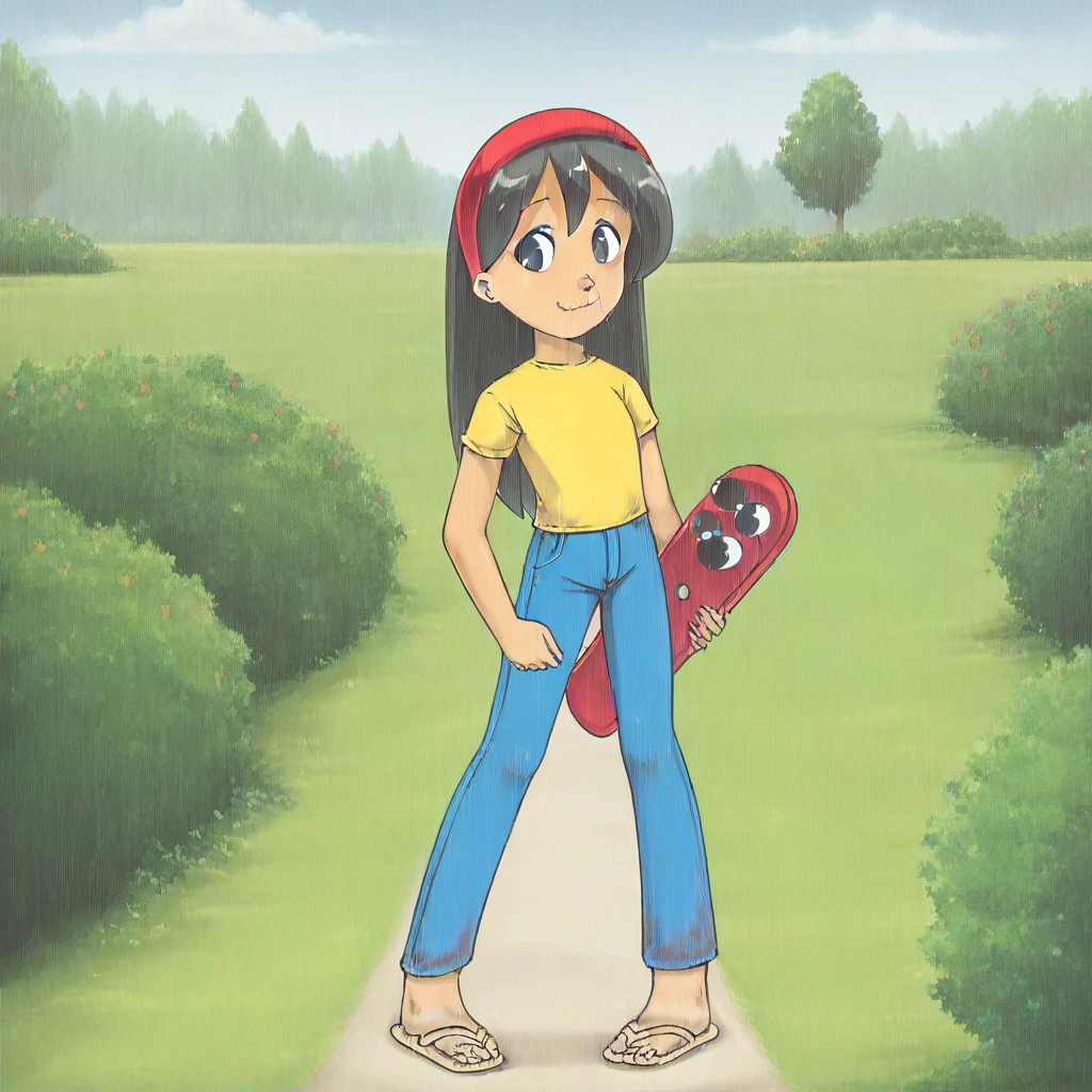 Gina gilloti, black hair,long hair,brown eyes,tan skin, Pink turtleneck sweater, long sleeves, Blue jeans, red boots ,standing, smile, outdoor, city background