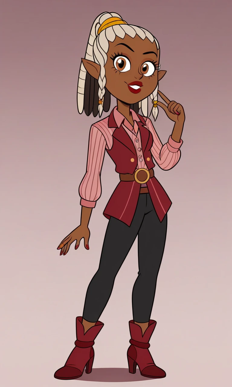 skara, dark brown skin, pointy ears, eyes with gray irises, braided hair, dark red lipstick, pale peach shirt, maroon stripes, red vest, brown belt, black pants, red ankle-length heeled boots,