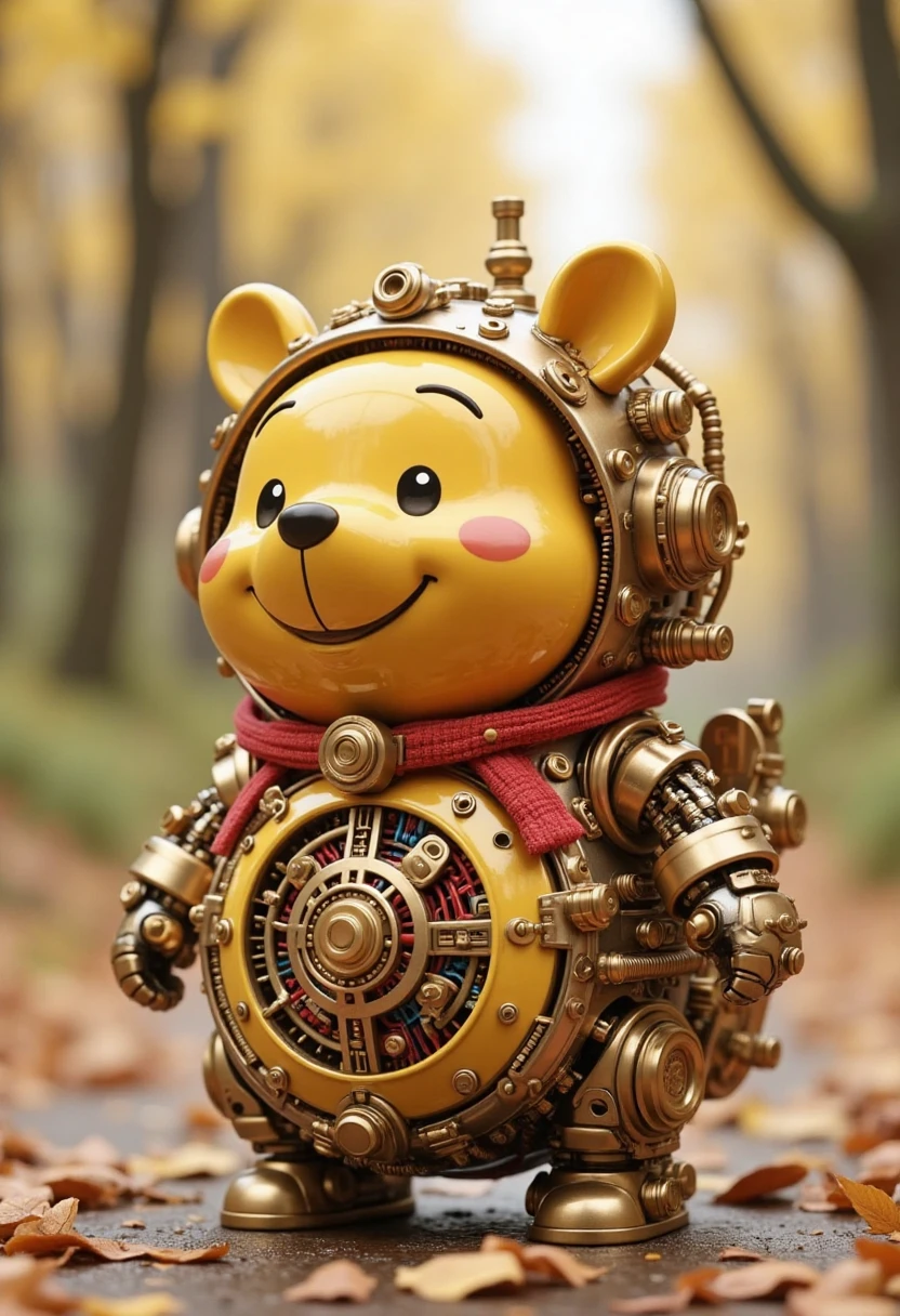 Steampunk - styled cartoon characters, ?????? the Pooh - themed, honey - gold metal, gear - honey pot details, round mechanical tummy, sweet - steam look, simple scene.
