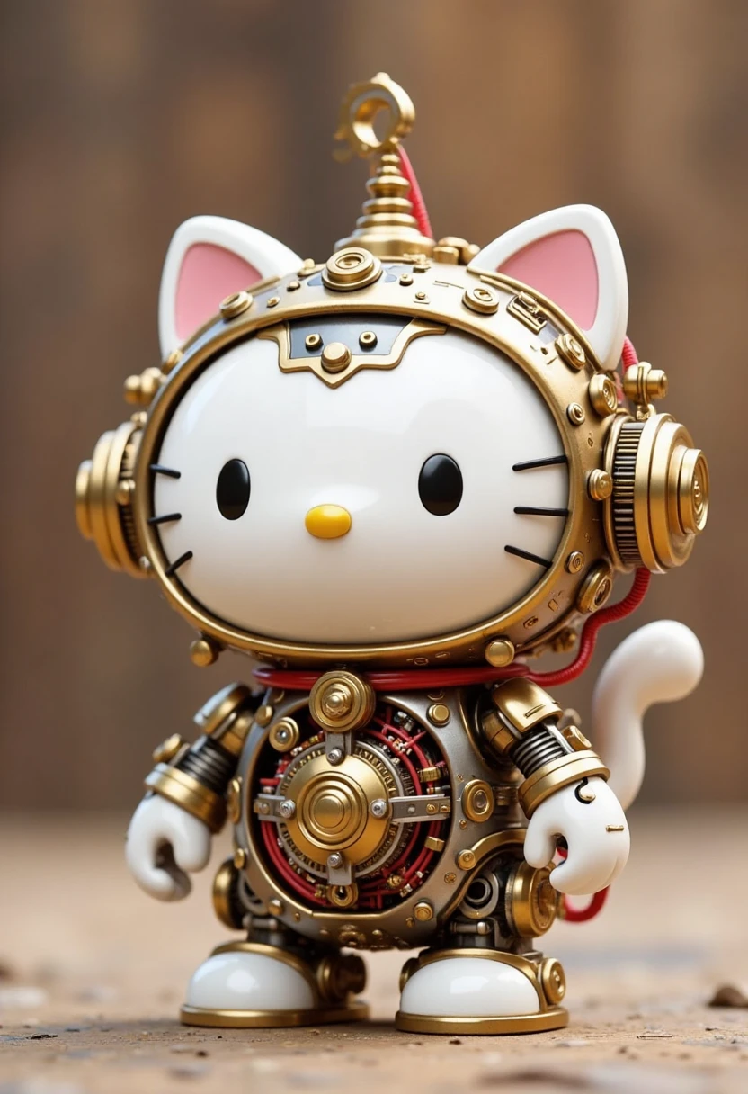 Steampunk - styled cartoon characters, Hello Kitty - based, small metal frame, pink - accented gears, round mechanical head, delicate steam details, simple scene.