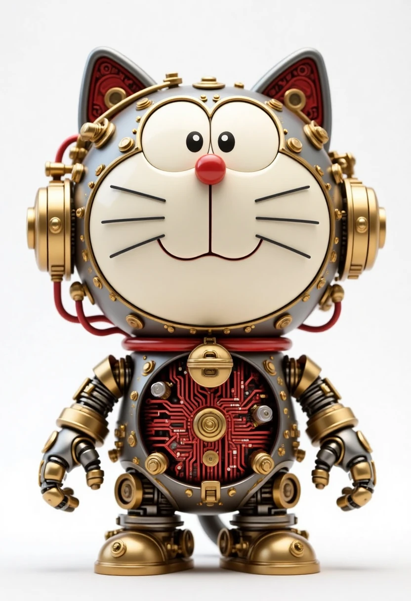 Steampunk - styled cartoon characters, Doraemon - inspired, brass body, exposed red circuits on chest, mechanical tail, cute - yet - industrial look, plain setting.