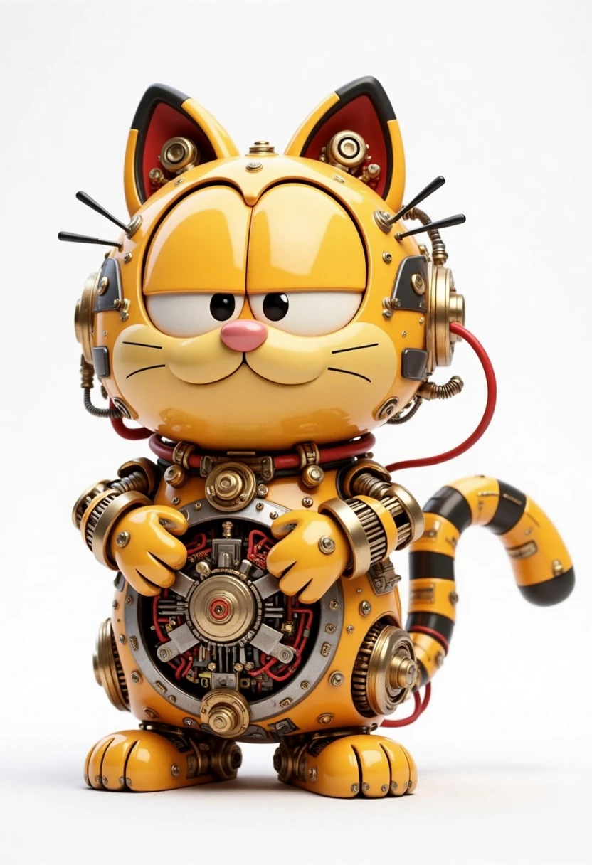 Steampunk - styled cartoon characters, Garfield - inspired, orange - metal fur, gear - filled belly, mechanical tail, lazy - steam attitude, plain setting.