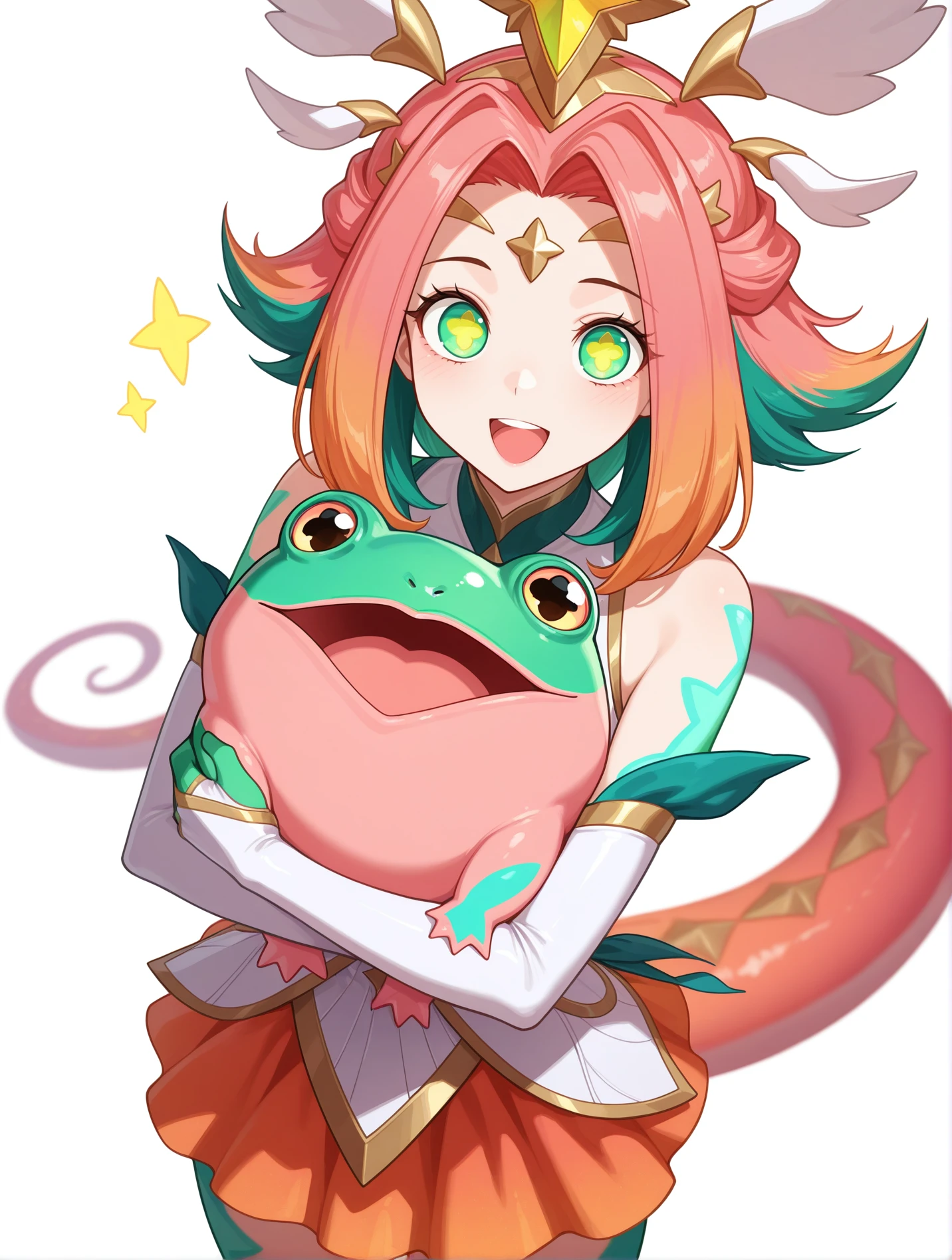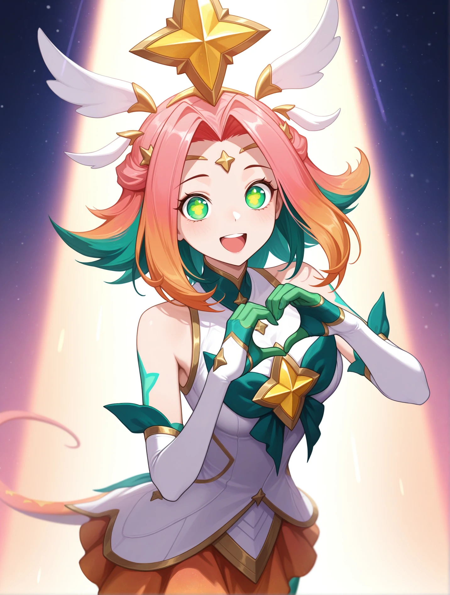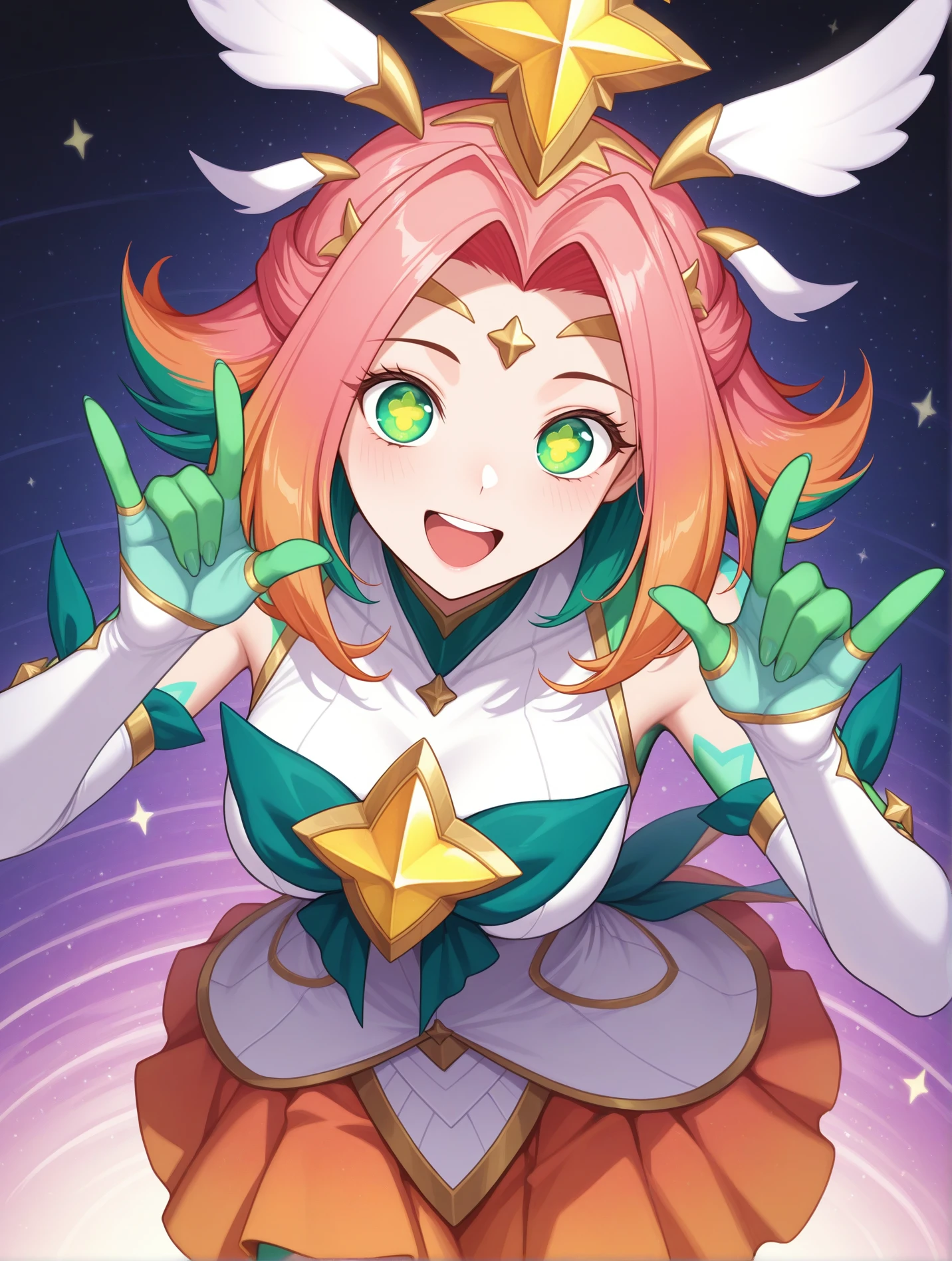 Main tags - "green eyes, star-shaped pupils, multicolored hair, green hair, pink hair, orange hair, hair ornament, tiara"