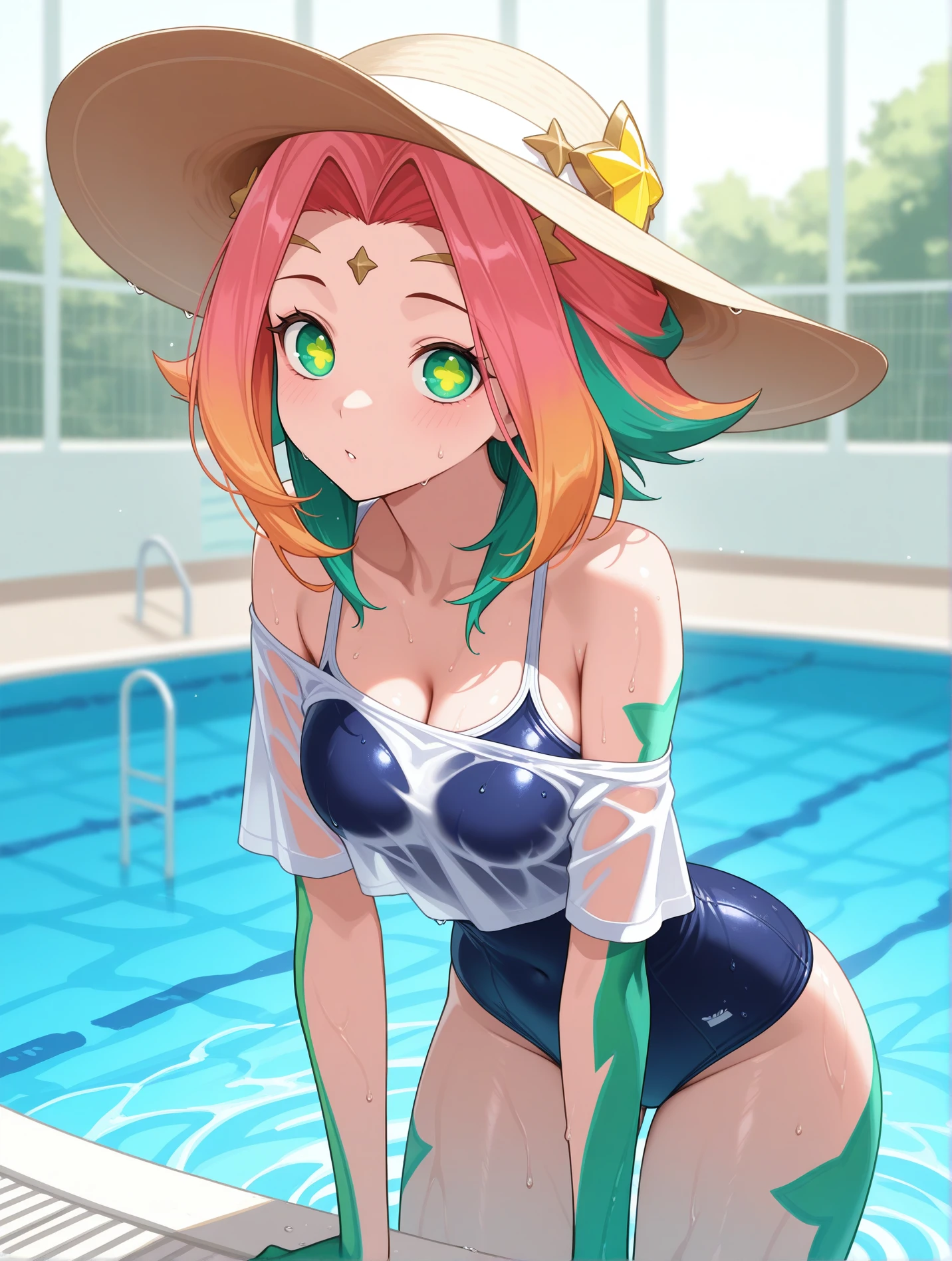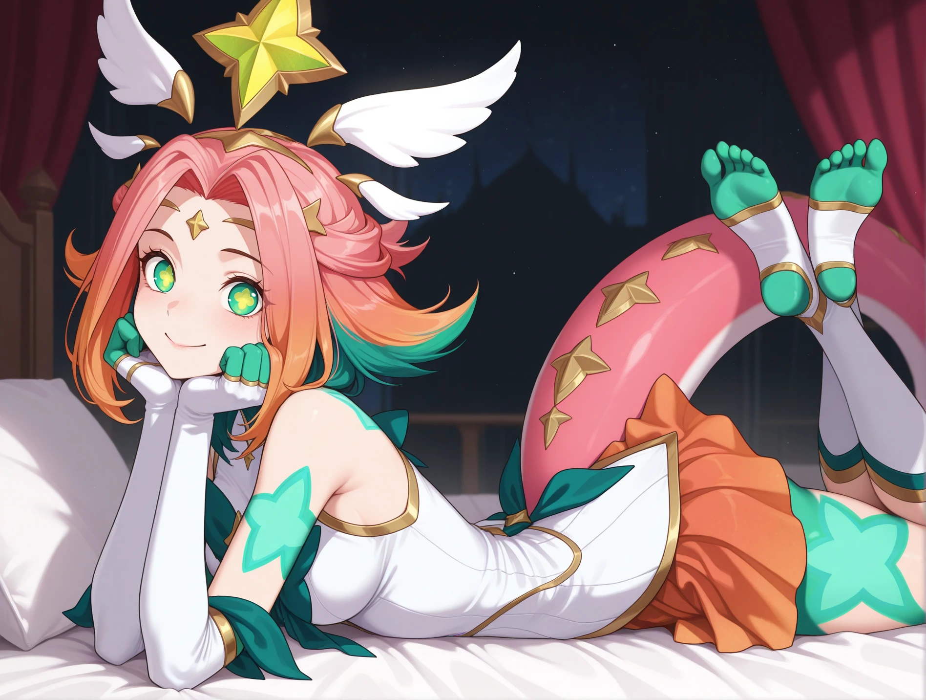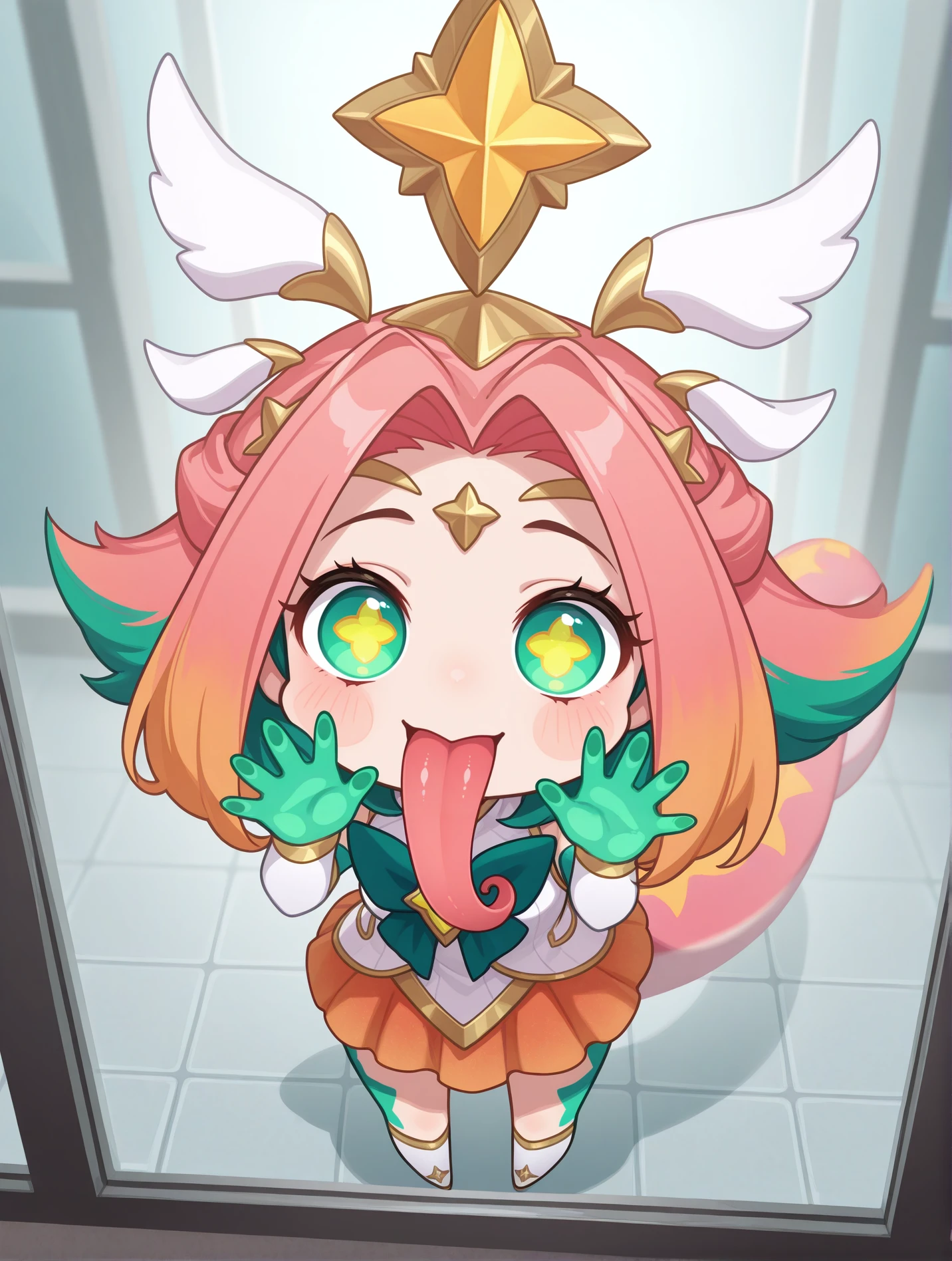 Main tags - "green eyes, star-shaped pupils, multicolored hair, green hair, pink hair, orange hair, hair ornament, tiara"