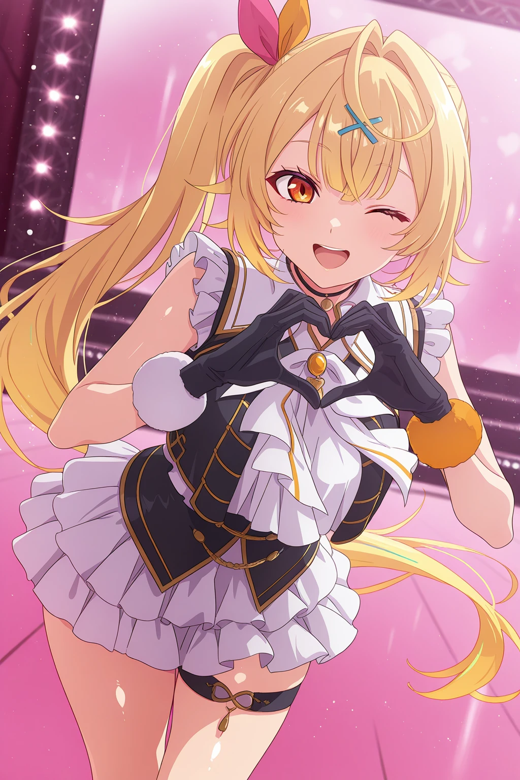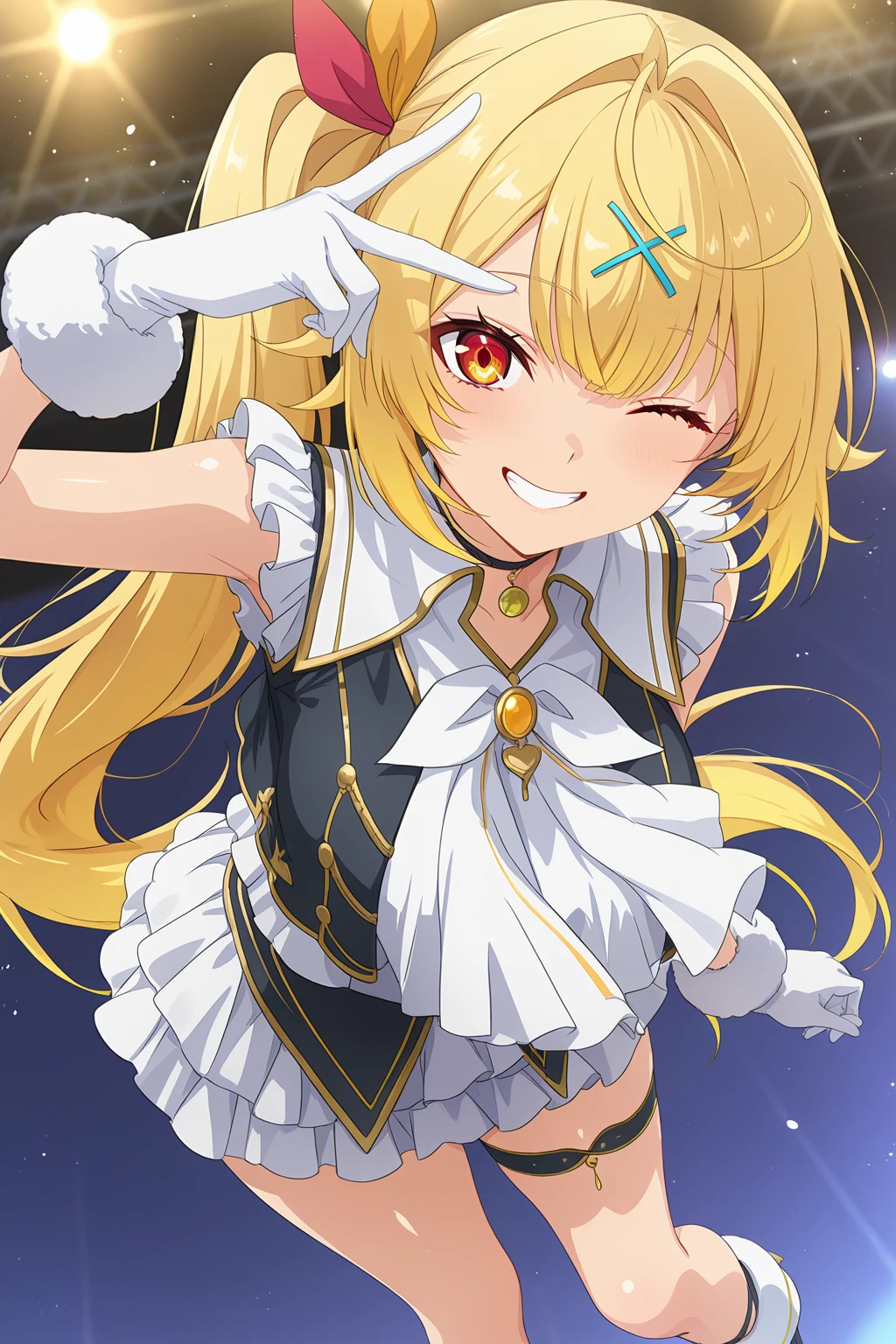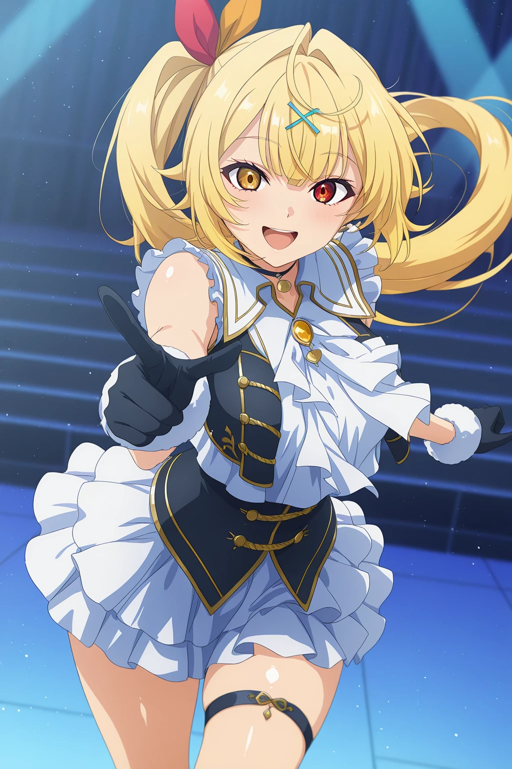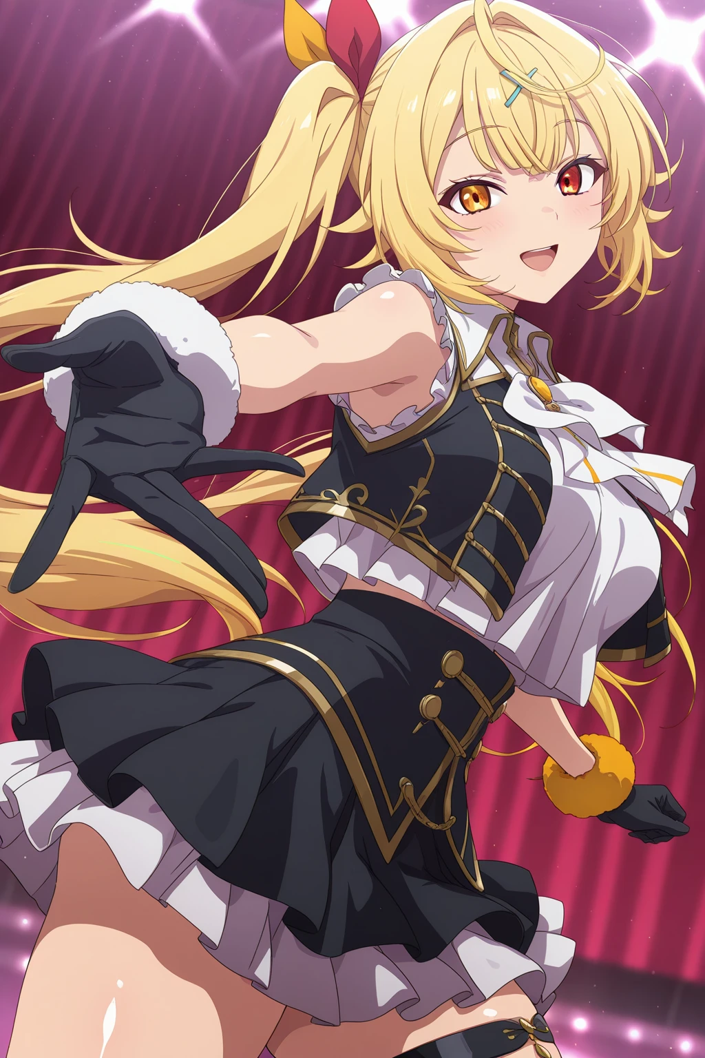 HSNJ, long hair, blonde hair, side ponytail, yellow eyes, heterochromia, red eyes, large breasts, hair ribbon, x hair ornament, green hair ornament, white ascot, frilled shirt, sleeveless shirt, vest, fur-trimmed gloves, skirt set, layered skirt, thigh strap, bell, ankle boots