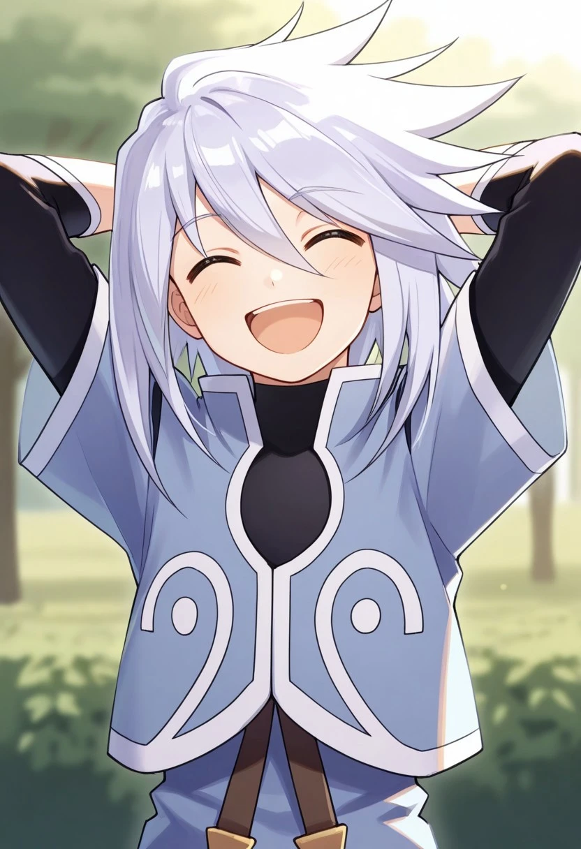 genis, solo, male focus, 1boy, boots, long hair, shirt, shorts, jacket, black shirt, blue jacket, blue shorts, bracelet, blue footwear, jewelry, silver hair, blue eyes,