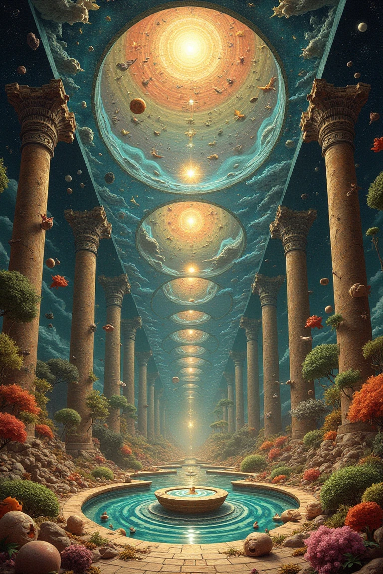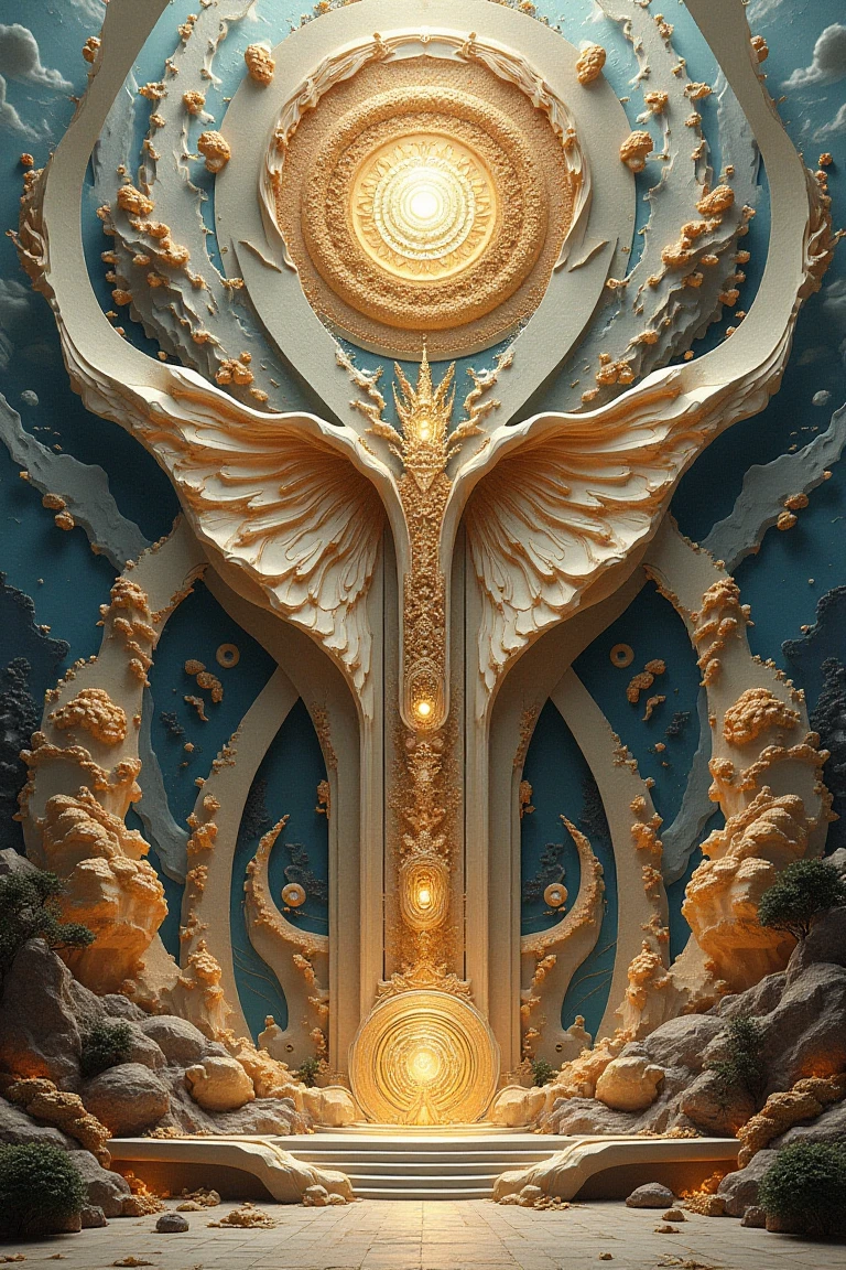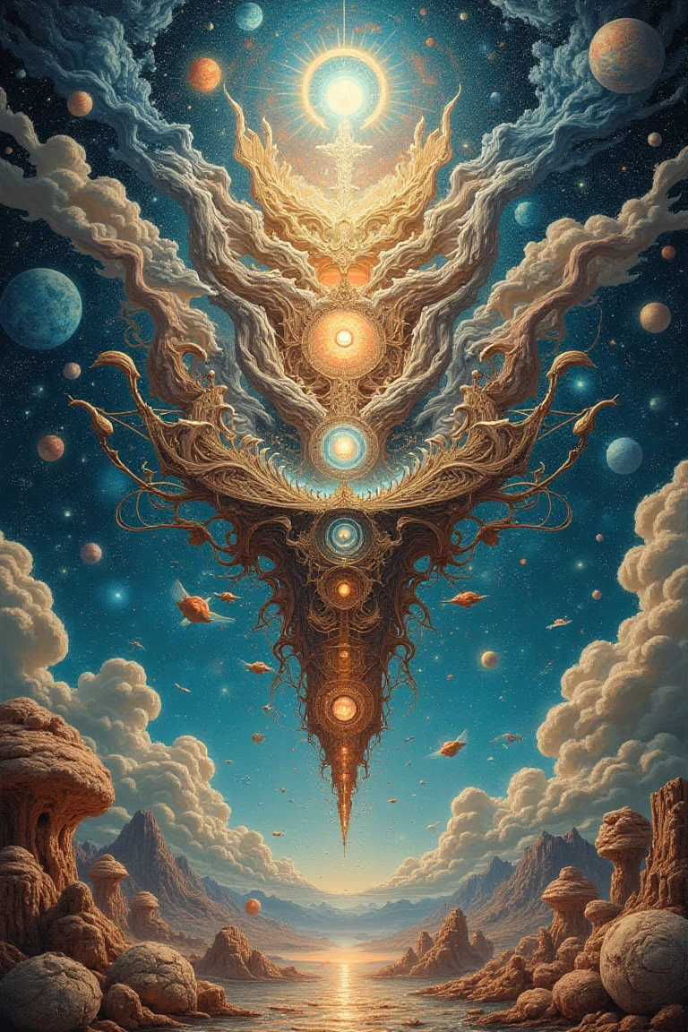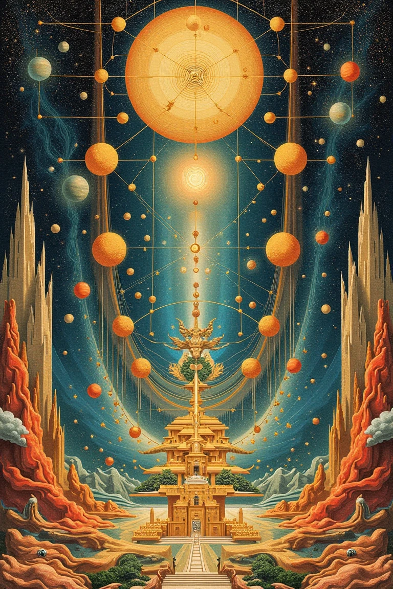 A surreal, luminous structure floating in a cosmic void—interwoven with geometric patterns, celestial symbols, and flowing organic forms.