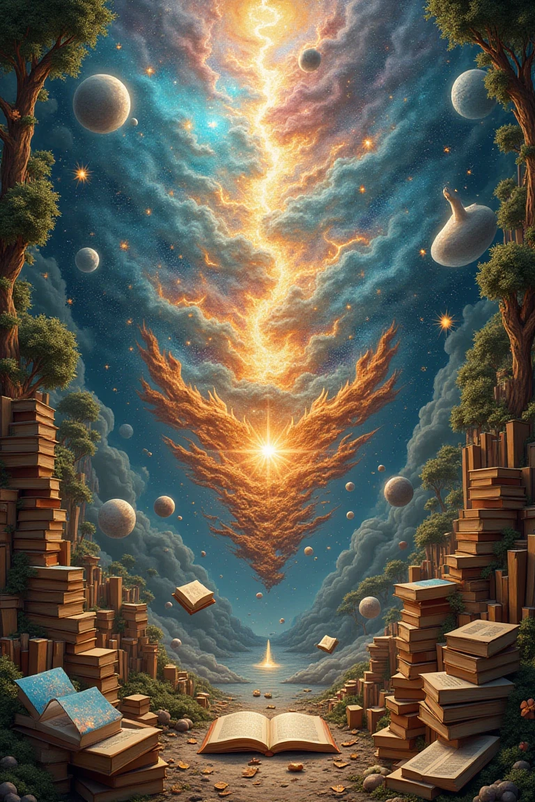An ethereal library suspended in a nebula, with books that dissolve into light and geometric constellations.