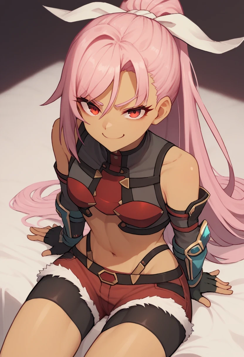 lizDef, pink hair, long hair, red eyes, high ponytail, white ribbon, dark-skinned female, bikini armor, crop top, red shorts, bike shorts under shorts, fur-trimmed shorts, bare shoulders, black gloves, elbow gloves, fingerless glovesDescription