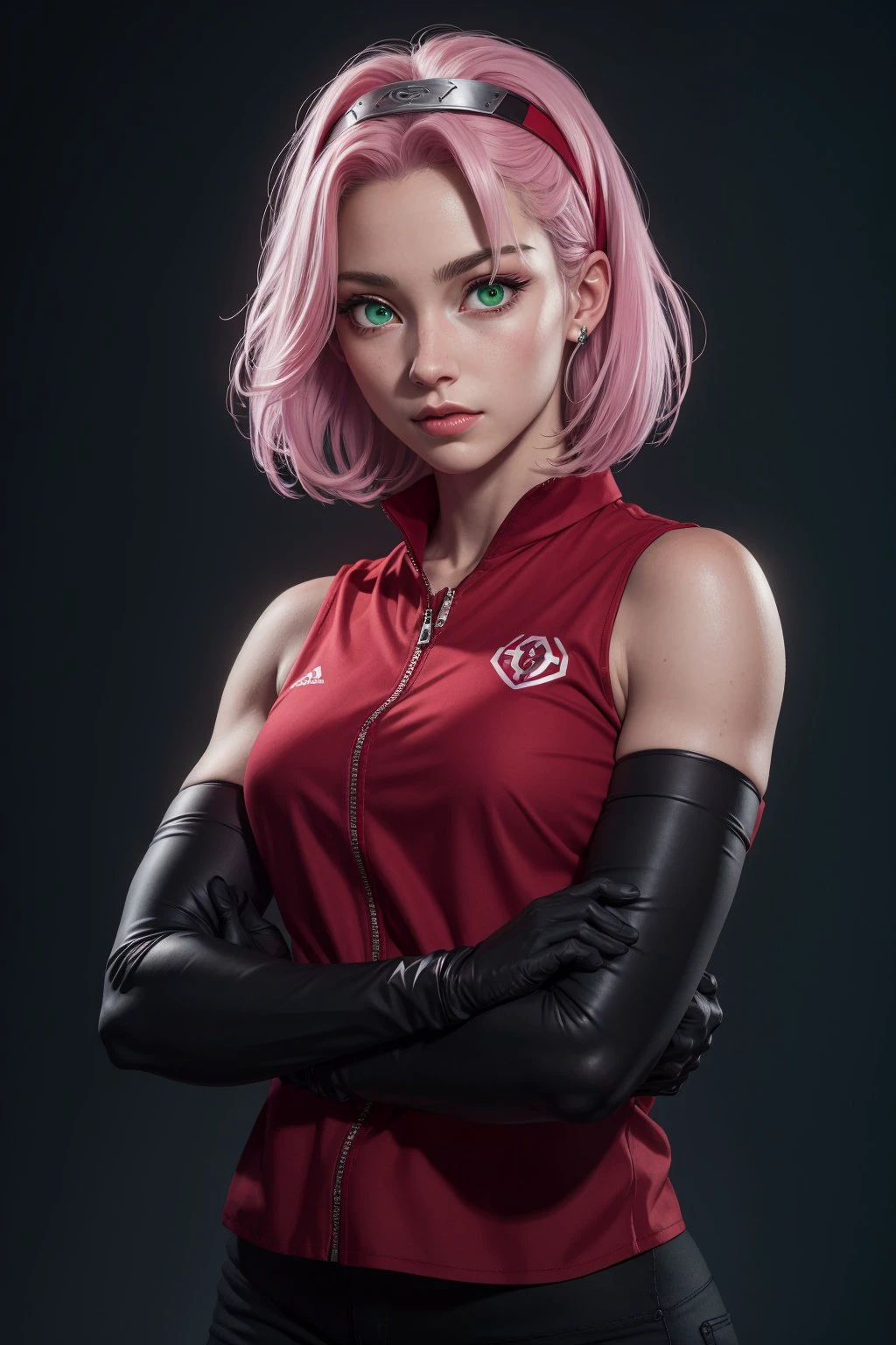 Pink hair, white pale skin, pink eyes, short straight forward hair, black lycra shorts under skirt, white sleevles t-shirt
