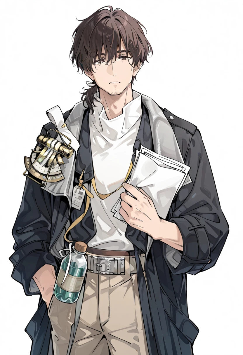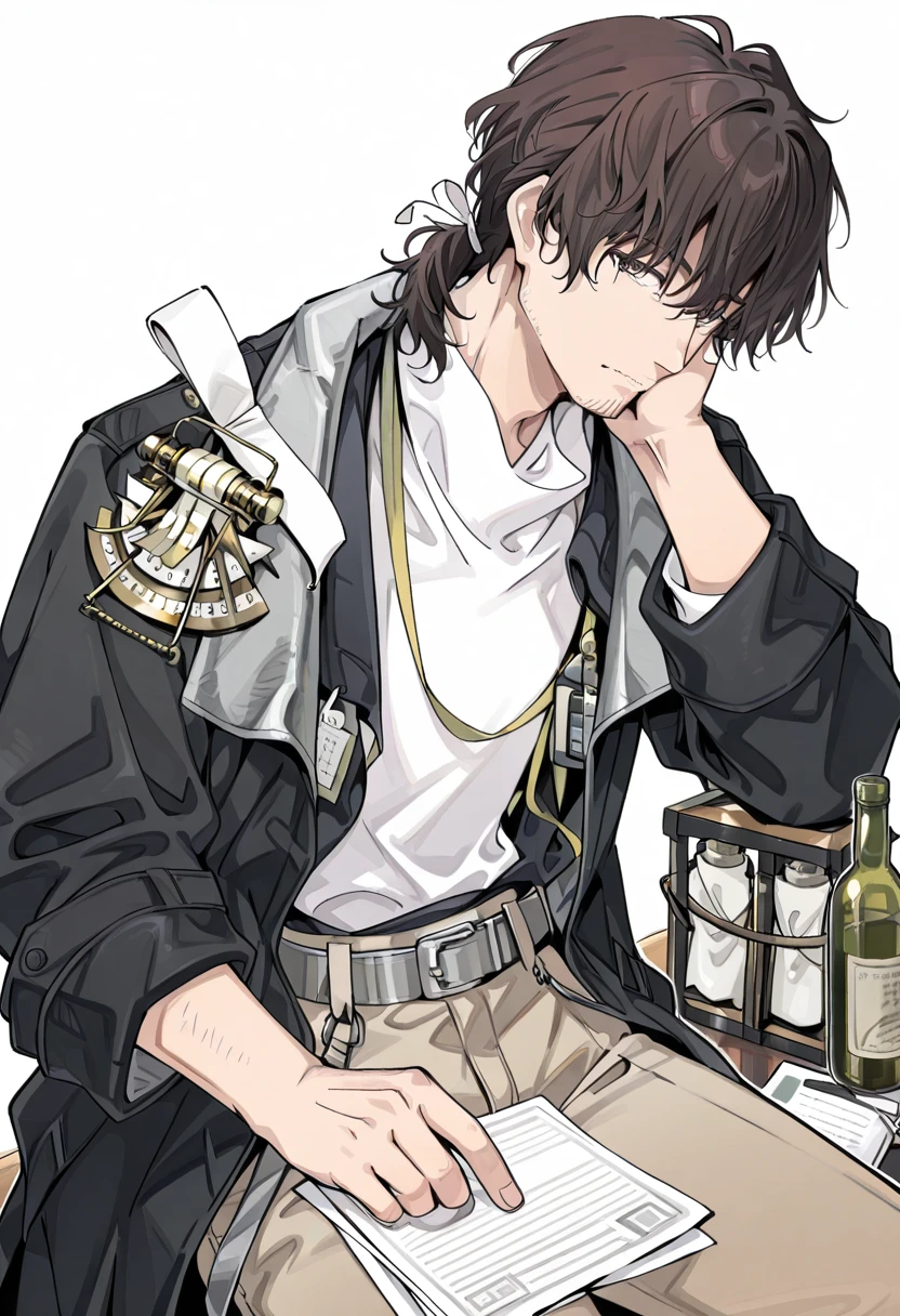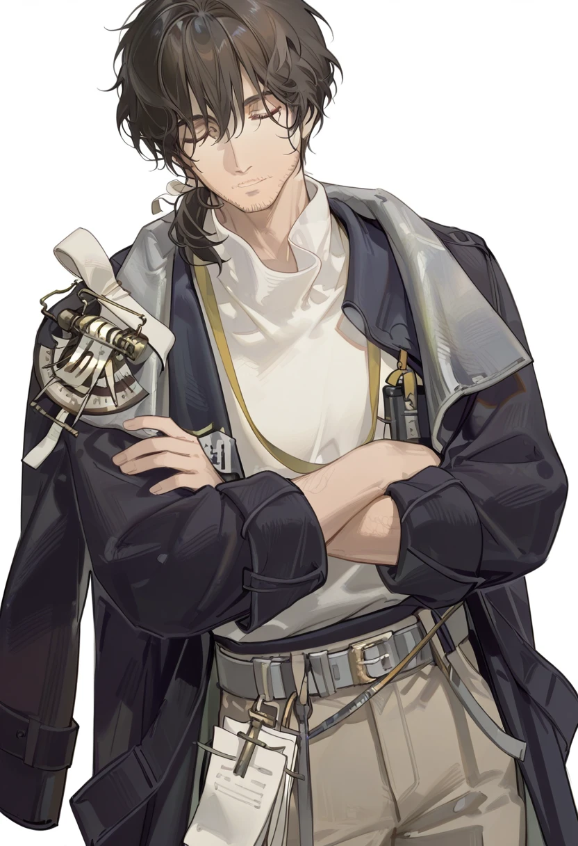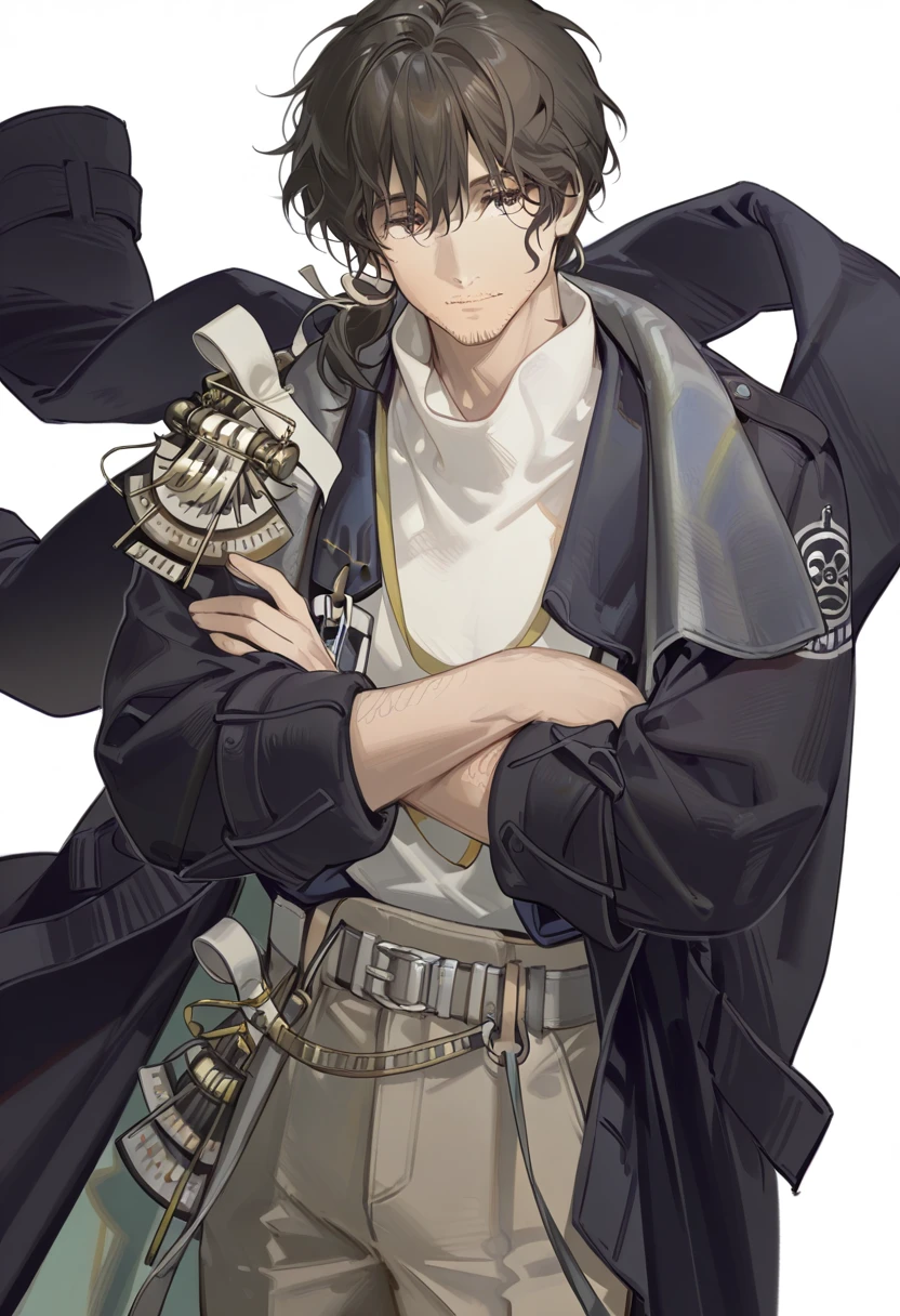 short hair,brown pants,open clothes,pants,low ponytail,mature male,stubble,hair between eyes,black coat,brown hair,bangs,<lora:reverse1999_enigma:0.9>,