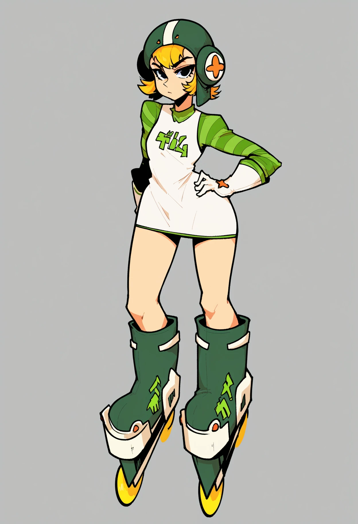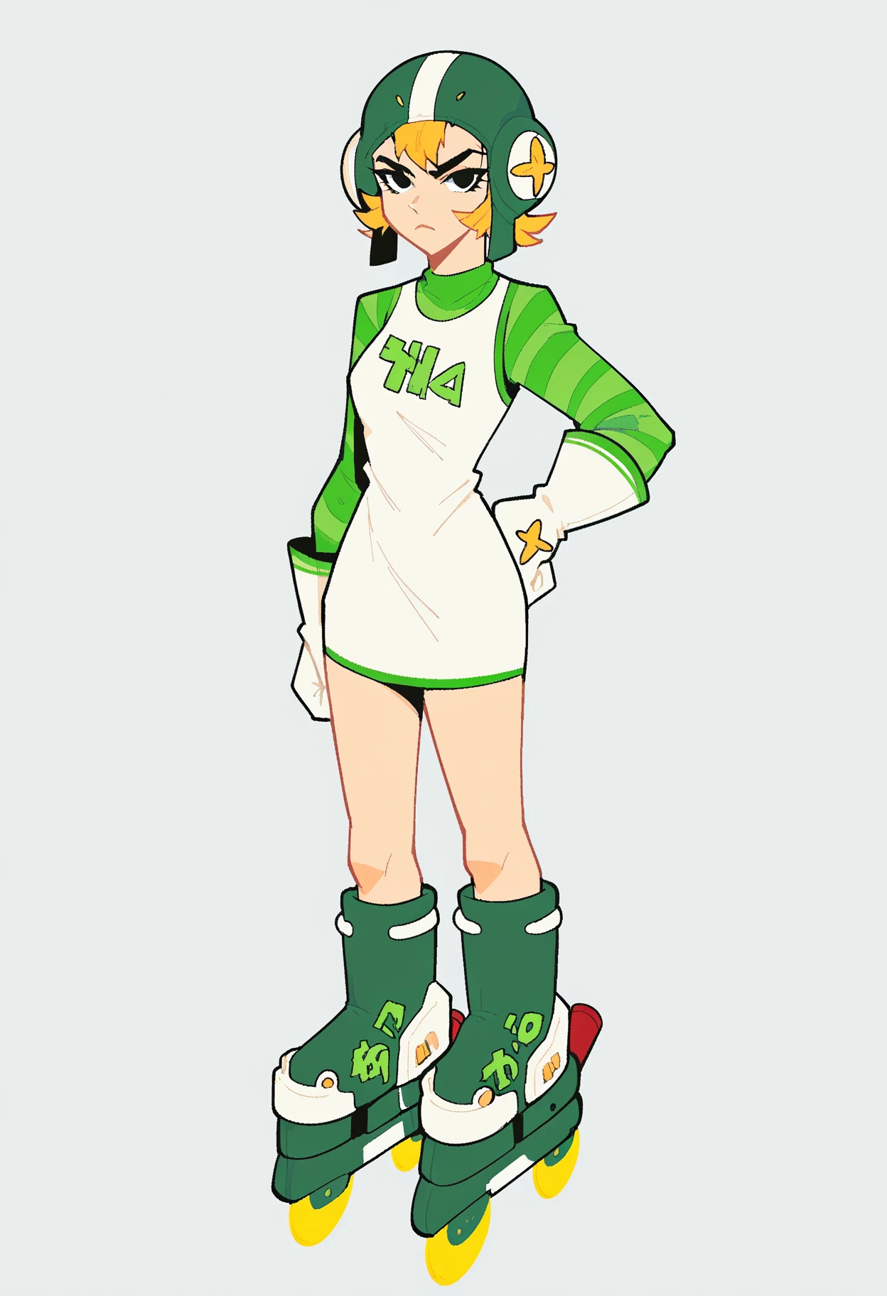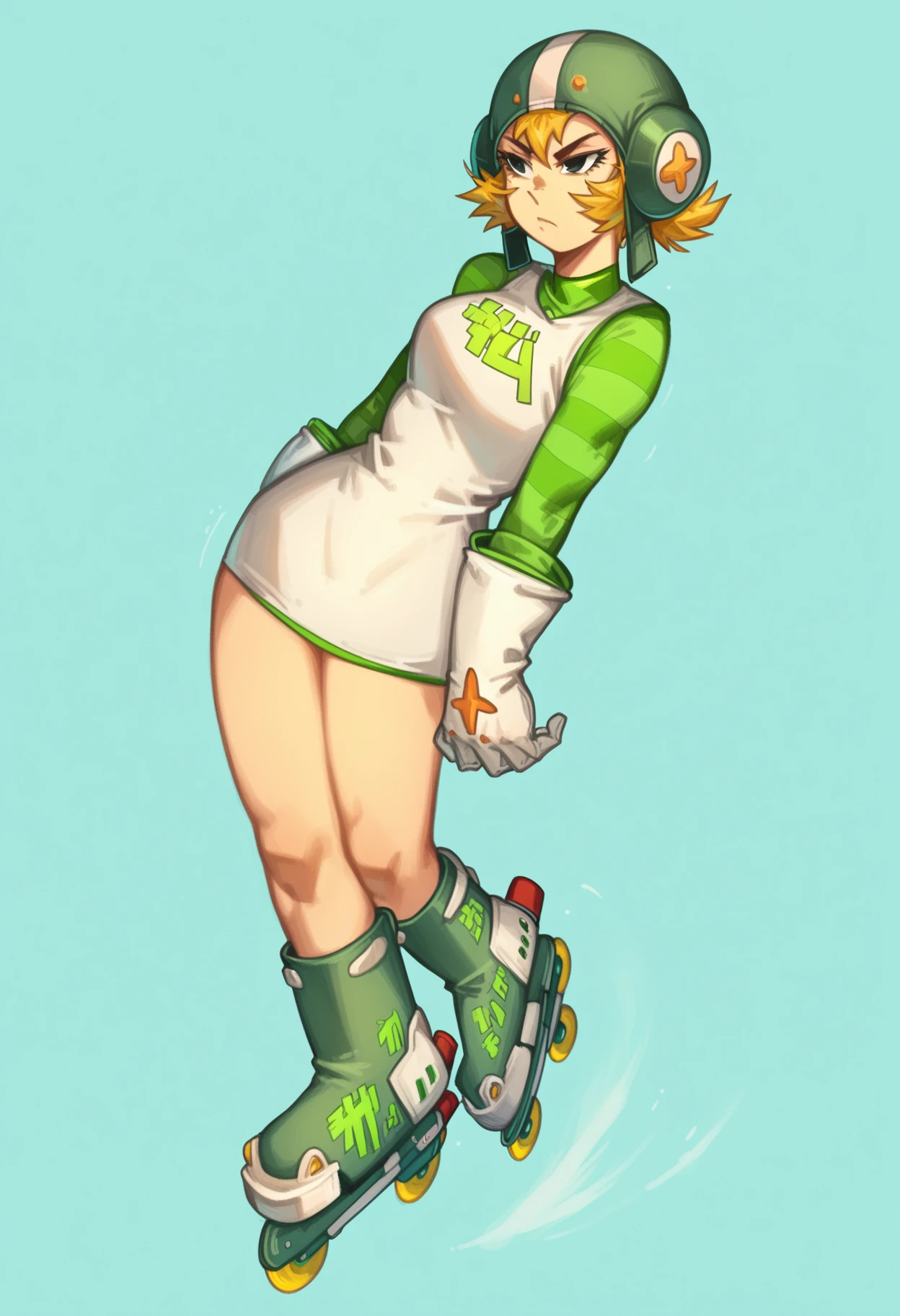 helmet, roller skates, blonde hair, dress, short hair, striped sleeves, white glovesβ Helpful Negatives β