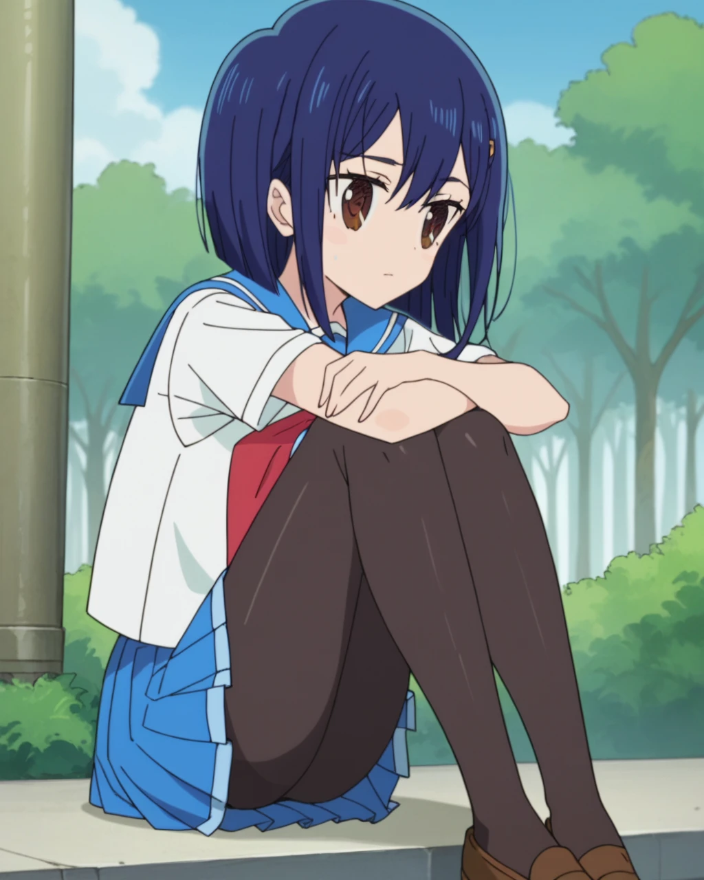 school uniform, serafuku, white shirt, blue sailor collar, skirt, pleated skirt, blue skirt, neckerchief, red neckerchief, thighhighs, black thighhighs,