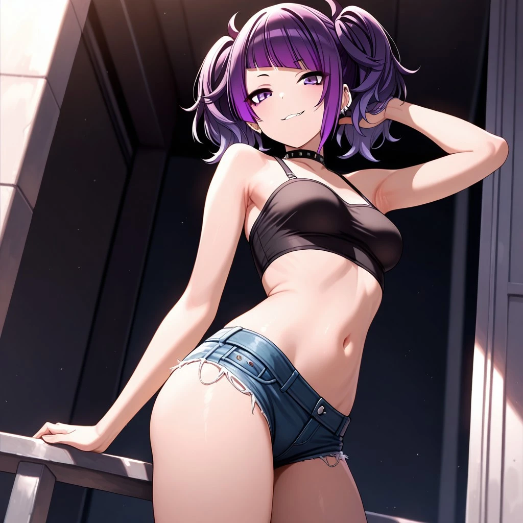 purple hair,purple eyes,diagonal bangs,blunt bangs,twintails,medium breasts,