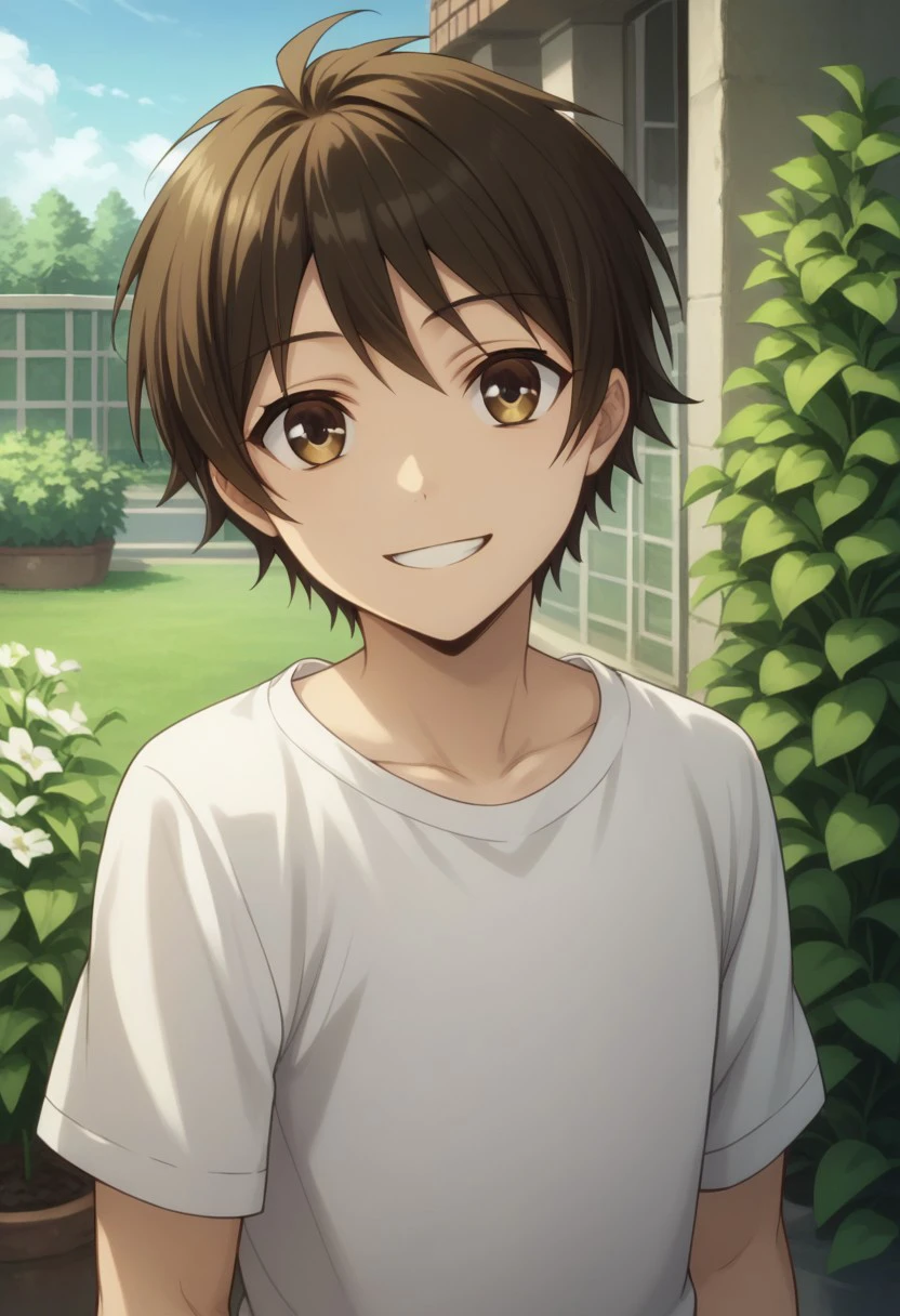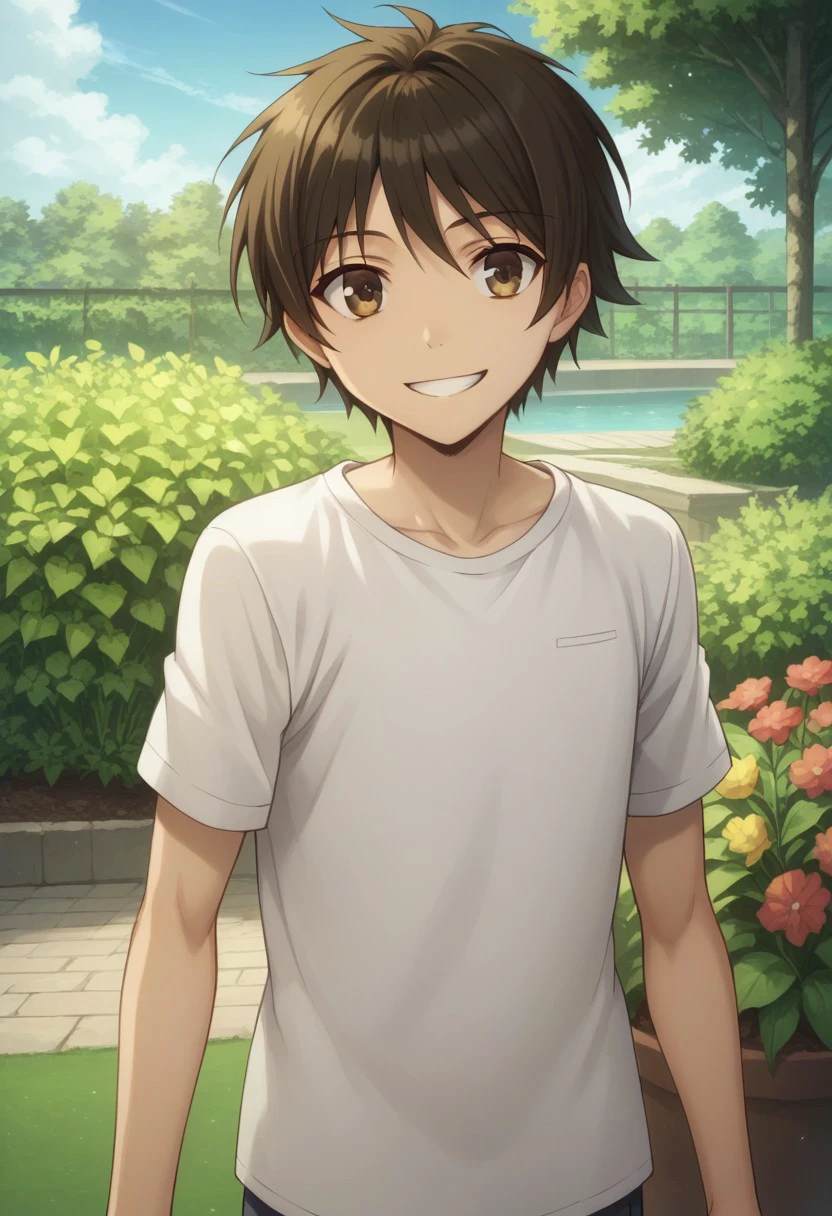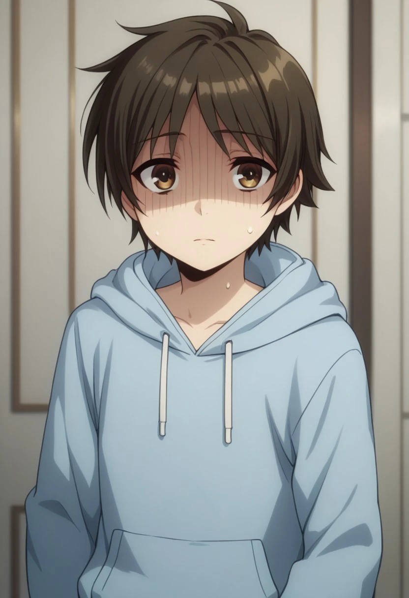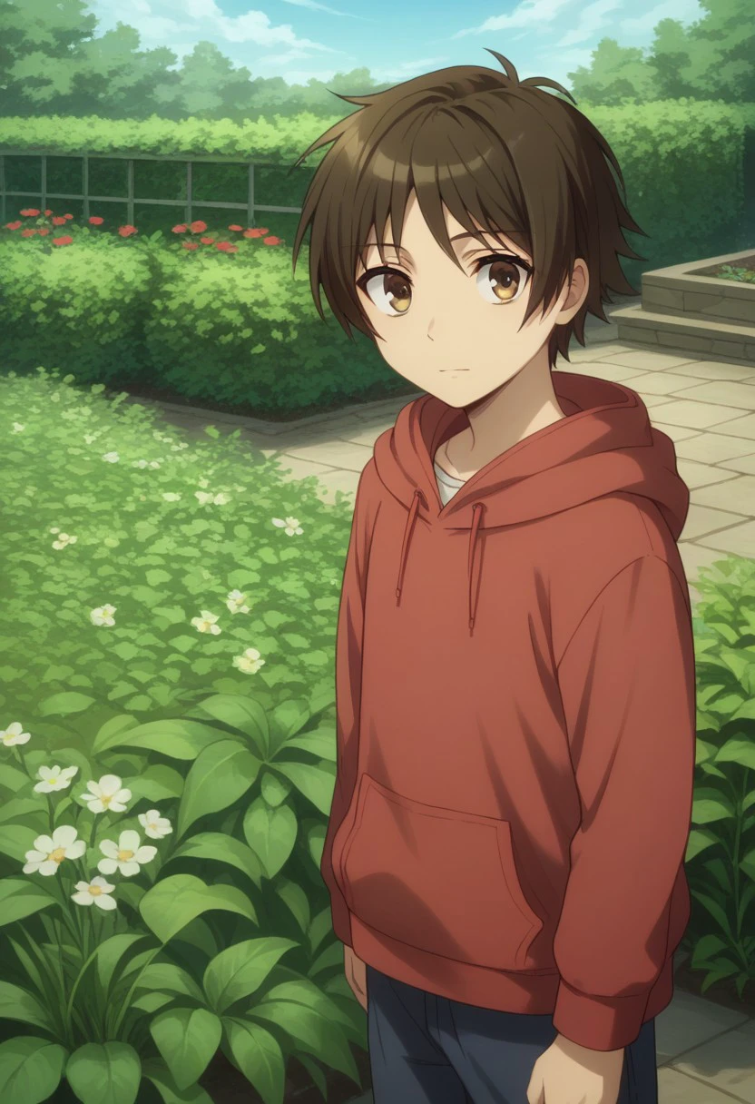 Uniform: komiya, necktie, socks, maid headdress, male focus, brown eyes, shorts, maid, green shorts, apron, 1boy, black hair, short hair, shoes, black socks,