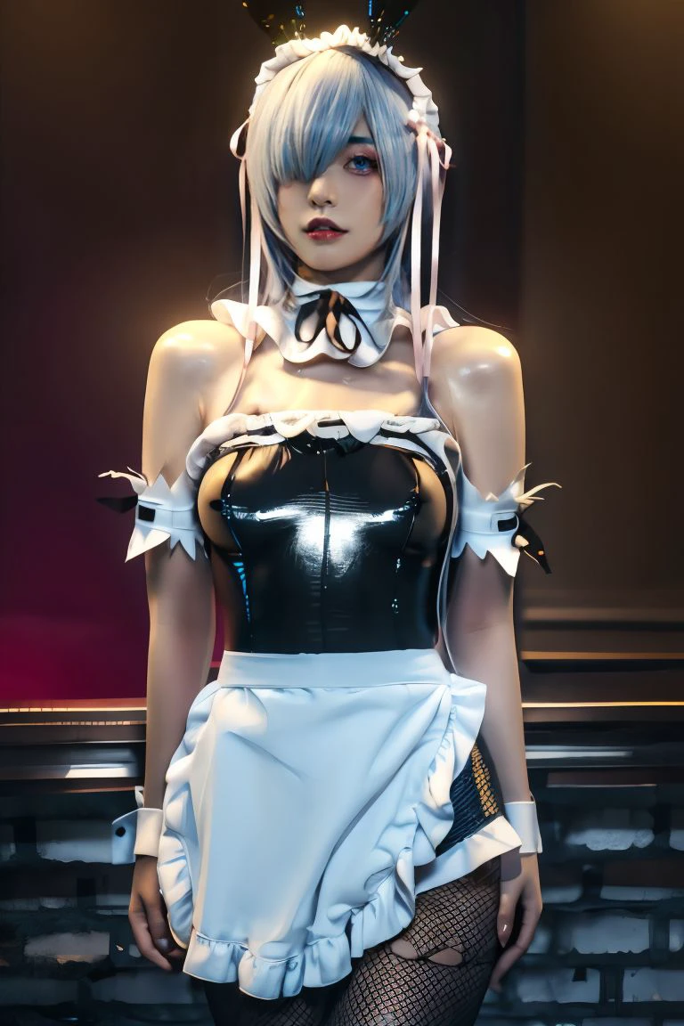 Recommend prompt: 1girl, solo, medium breasts, looking at viewer, realistic, photorealistic, long hair, maid headdress, blue hair, hair over one eye, blue eyes, parted lips, fishnet pantyhose, fishnet, pantyhose, maid, torn clothes, torn pantyhose, animal ears, apron, rabbit ears, waist apron,