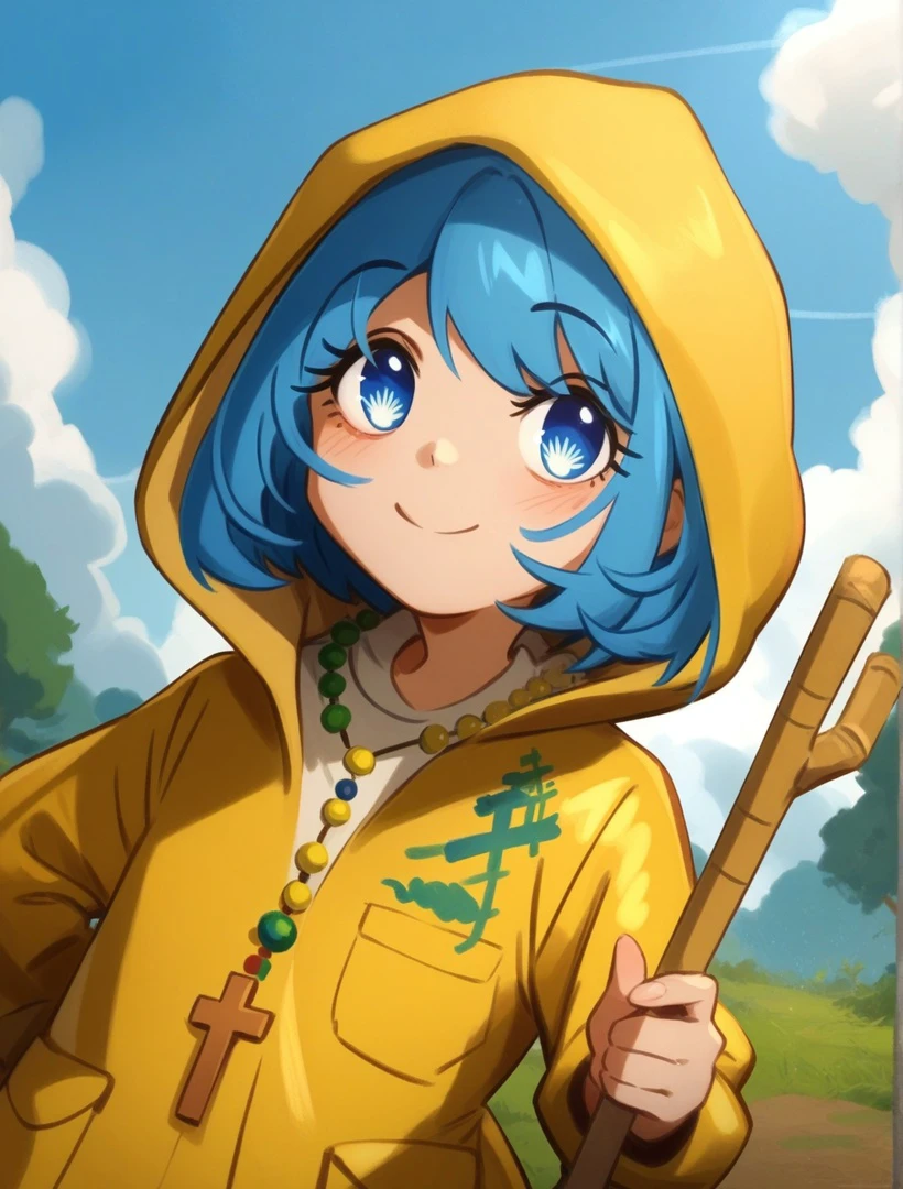 lucexlp, 1girl, solo, short hair, blue eyes, long sleeves, jewelry, blue hair, hood, necklace, coat, hood up, raincoat, yellow coat, yellow raincoat, holding staff, green footwear, rubber boots,