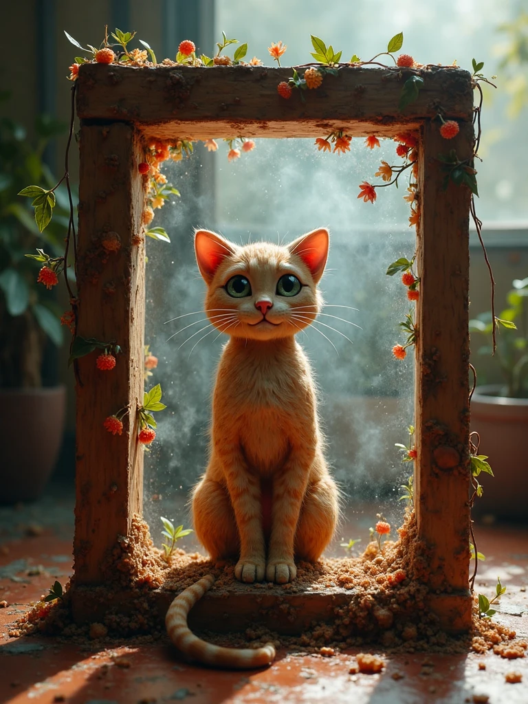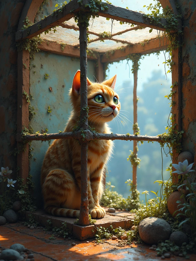 • Core Concept : Generates one cat positioned inside a geometric cube structure with transparent windows, set against varied backgrounds and customizable materials .