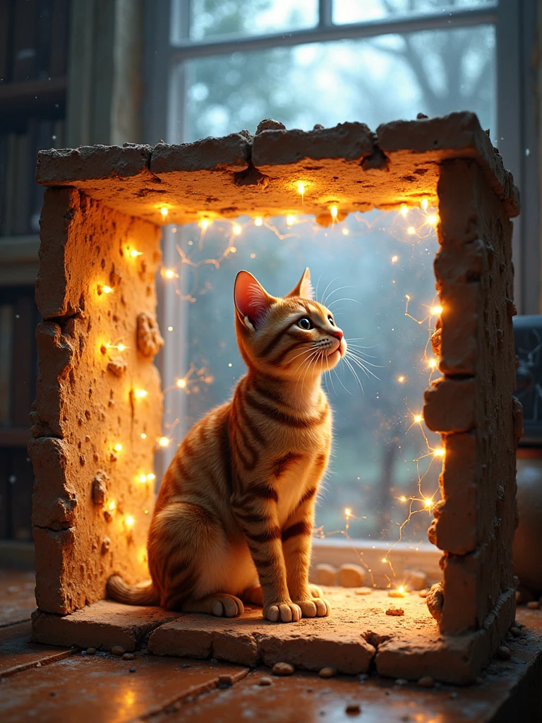 • "A fluffy tabby cat lounging inside a glass cube with wooden frames, surrounded by a neon Tokyo backdrop, hyperrealistic style."