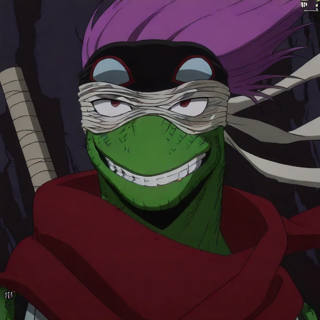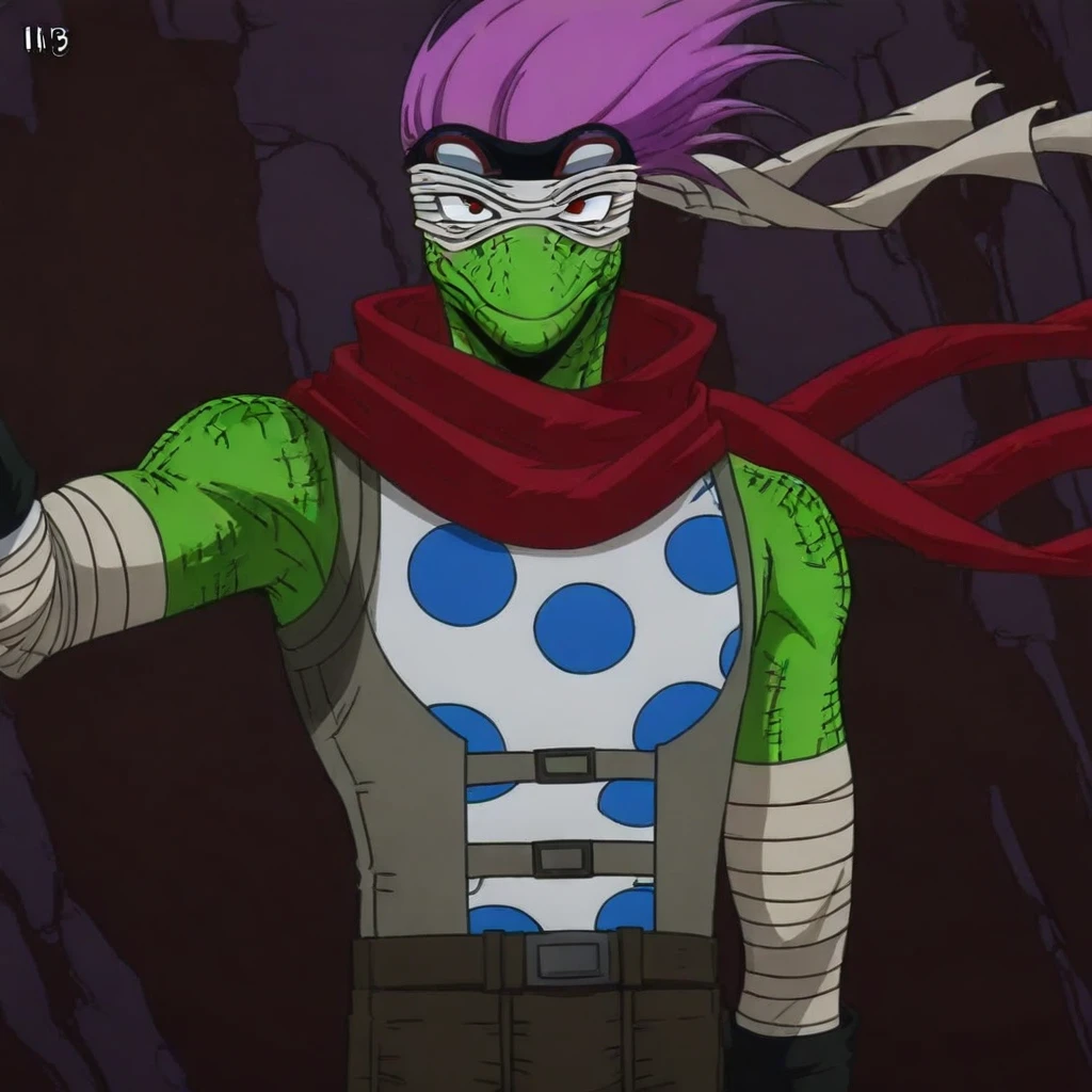 green skin, solo, red eyes, 1boy, source_anime, vest, score_9, boots, bandages, eye mask, reptile boy, full body, purple hair, pants, spinner