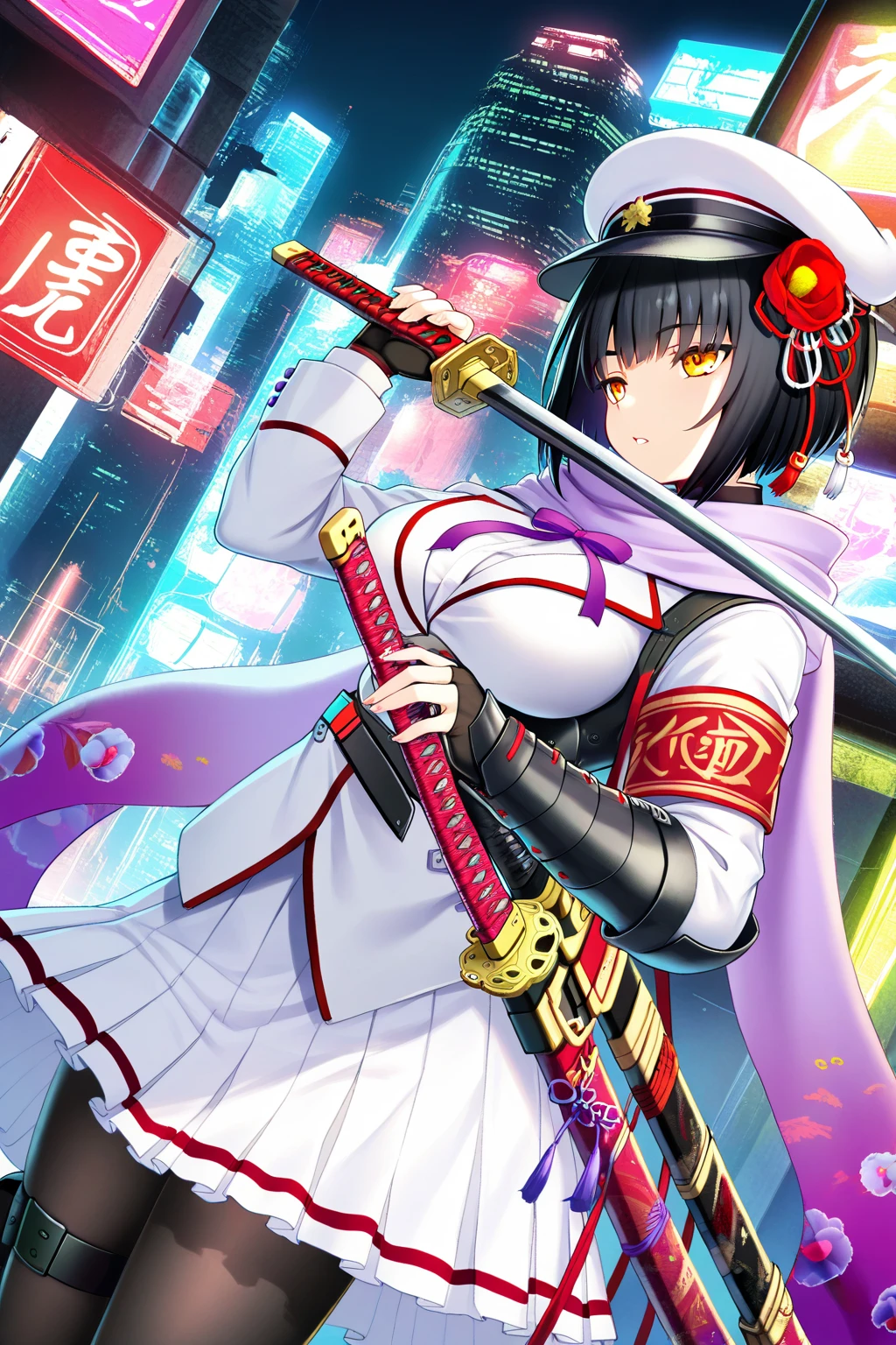 tn_pat, hair ornament, peaked cap, purple scarf, floral print, white jacket, white shirt, purple ribbon, long sleeves, red armband, black gauntlet, single black fingerless gloves, white pleated skirt, thigh strap, black pantyhose, black footwear, belts, sheath, scabbard, tassel,