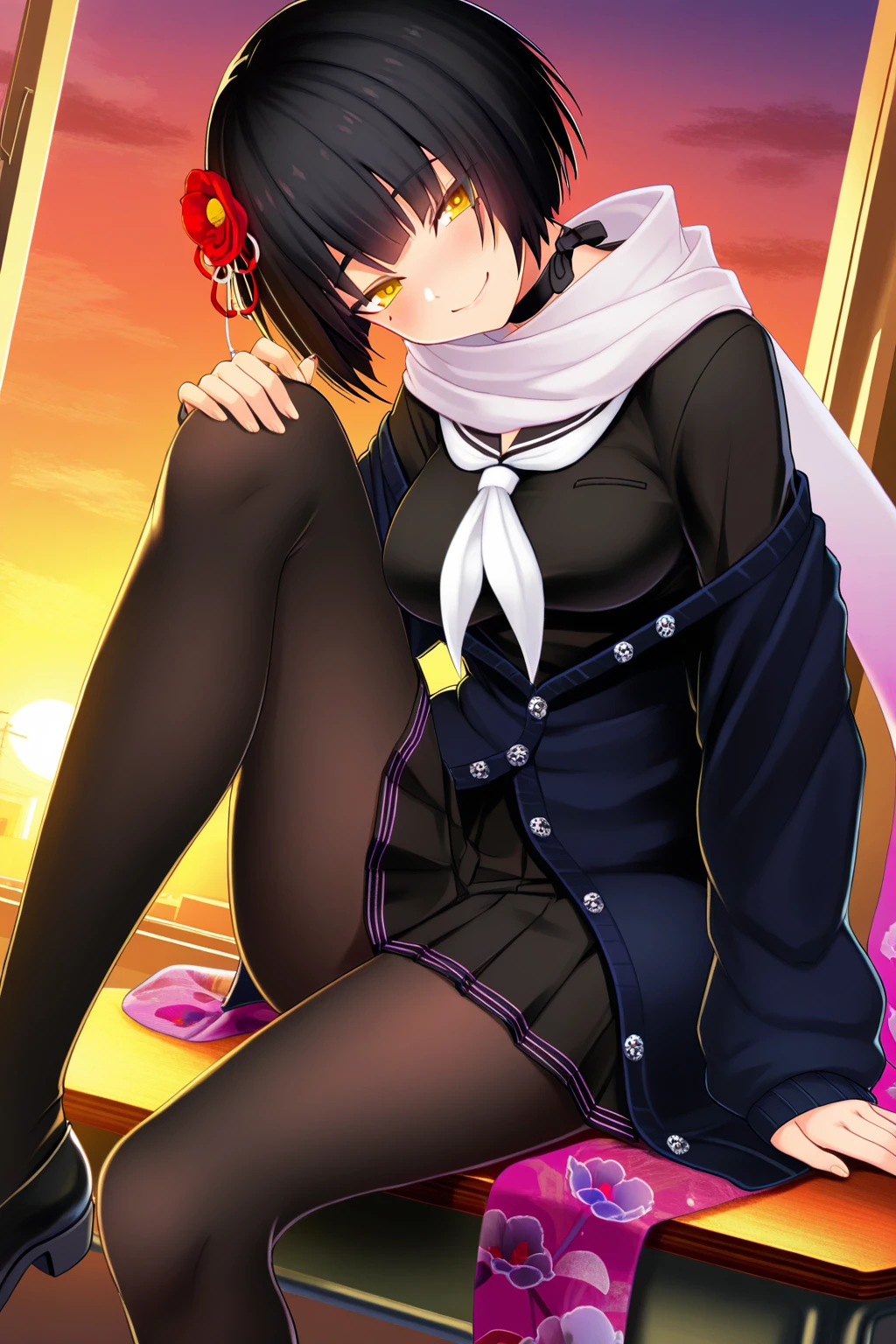 tn_def, hair ornament, black choker, white scarf, floral print, deep blue cardigan, long sleeves, off shoulder, white neckerchief, black serafuku, black pleated skirt, black pantyhose, black footwear,