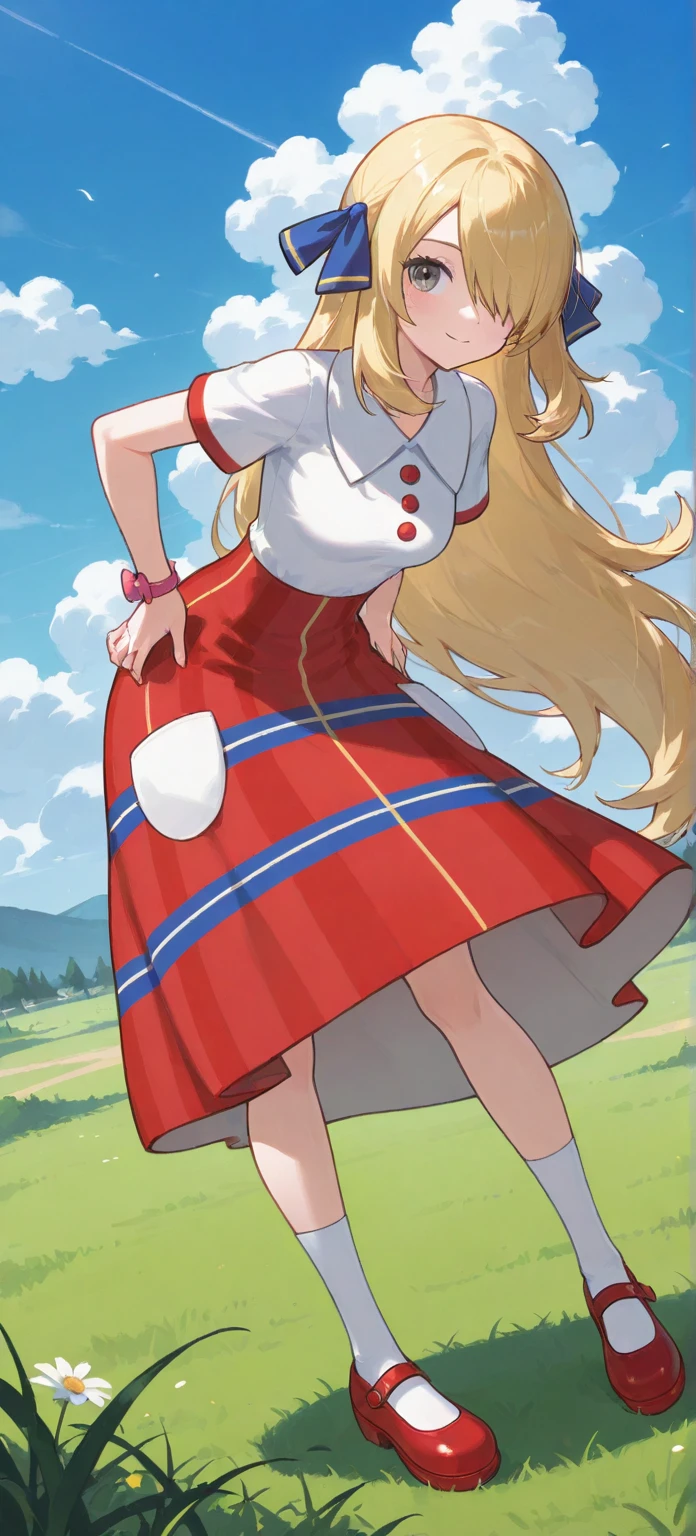 hair ribbon, blue ribbon. dress, collared shirt, white shirt, short sleeves, red buttons, red skirt, medium skirt, striped skirt, blue stripes, multicolored clothess, white pockets, wrist bow, pink bow, single bracelet, white socks, red footwear, mary janes