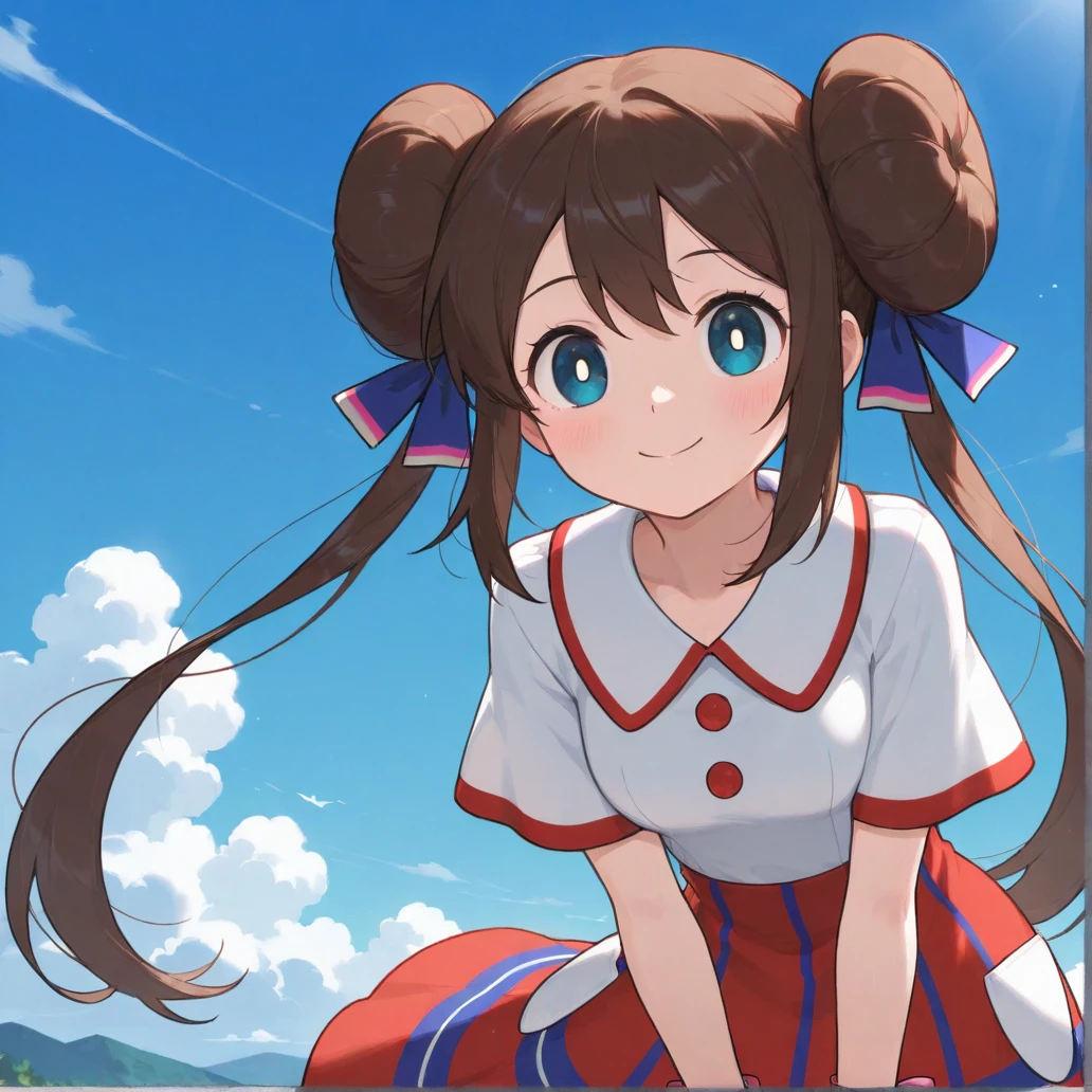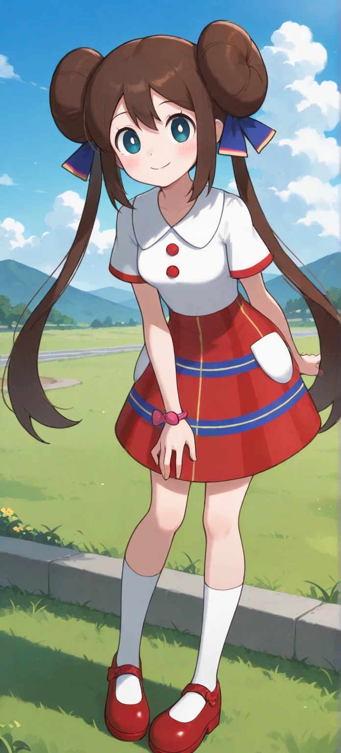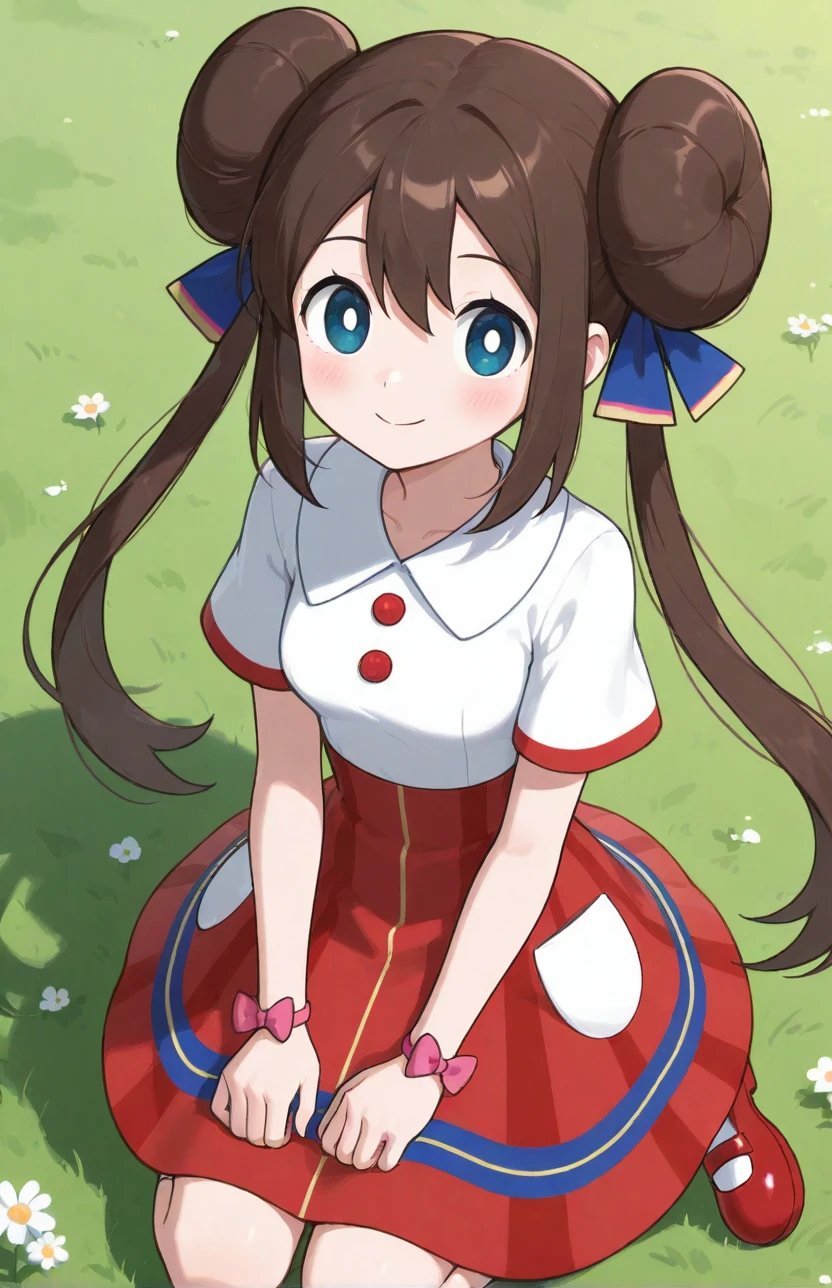 rosalnb, aged up, rosa_\(pokemon\), brown hair, blue eyes, white pupils, double bun, twintails