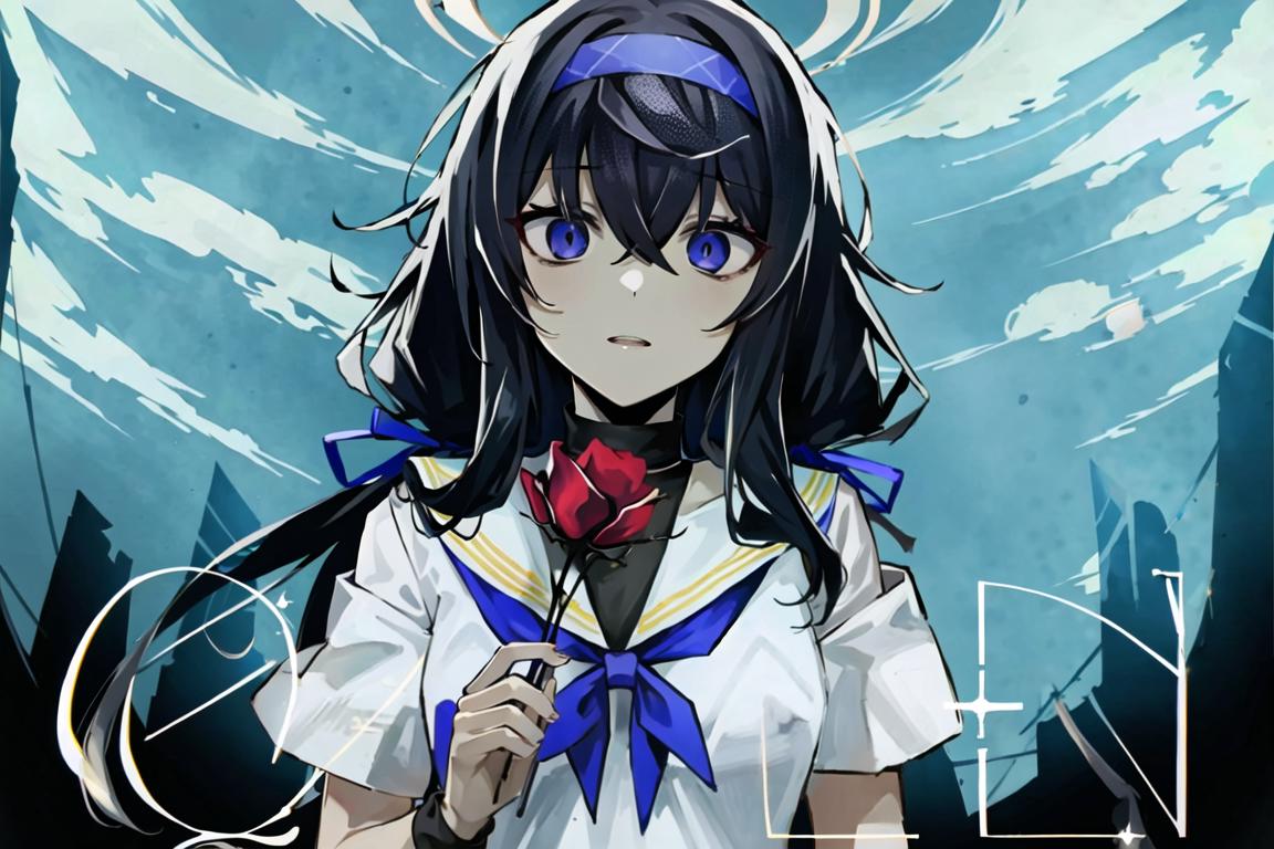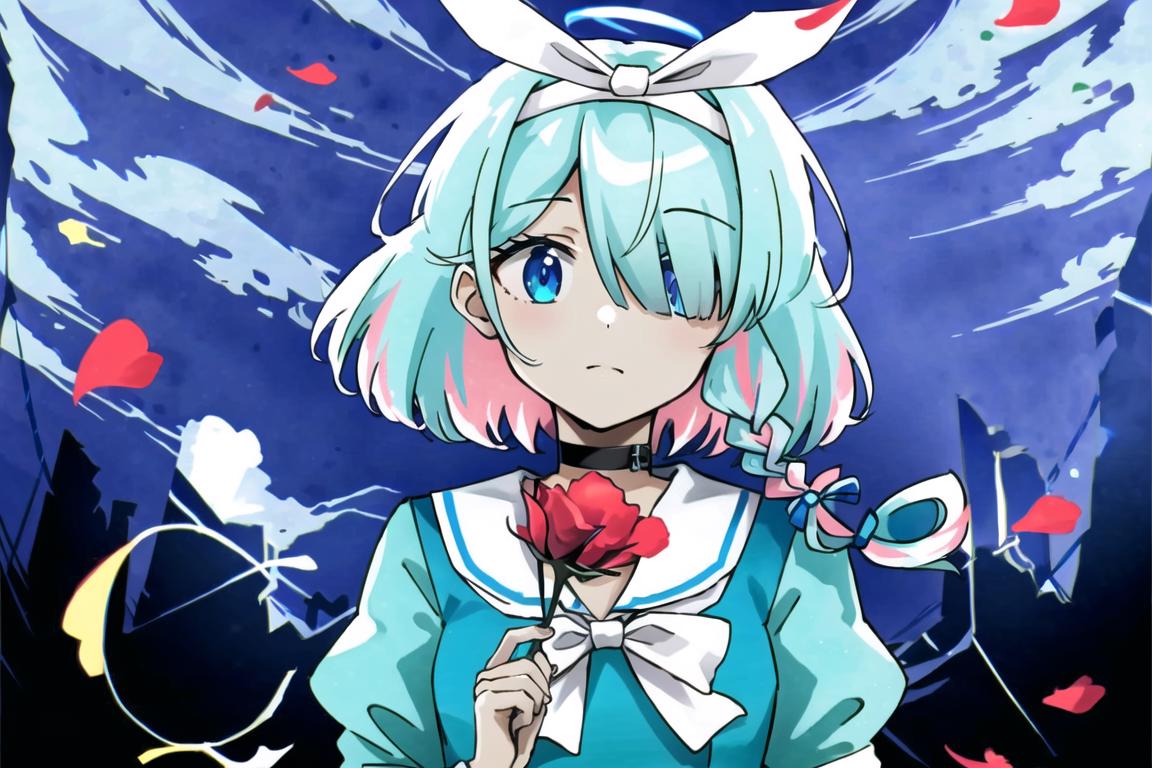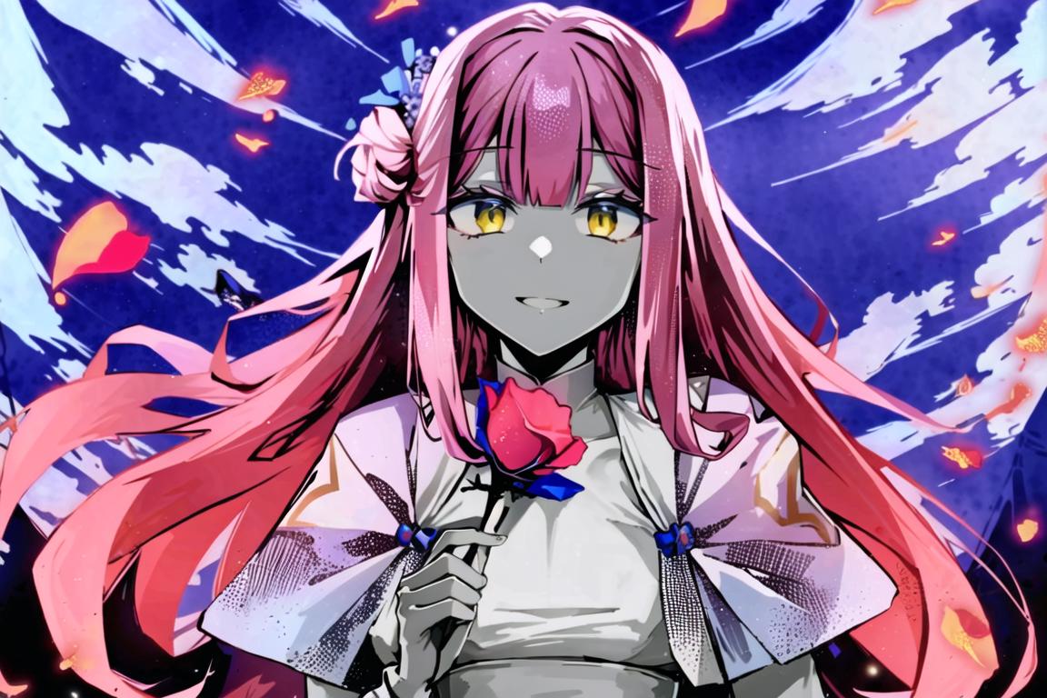 recommended prompt: queen, looking at viewer, holding, upper body, flower, sky, cloud, petals, rose, red flower, holding flower, straight-on