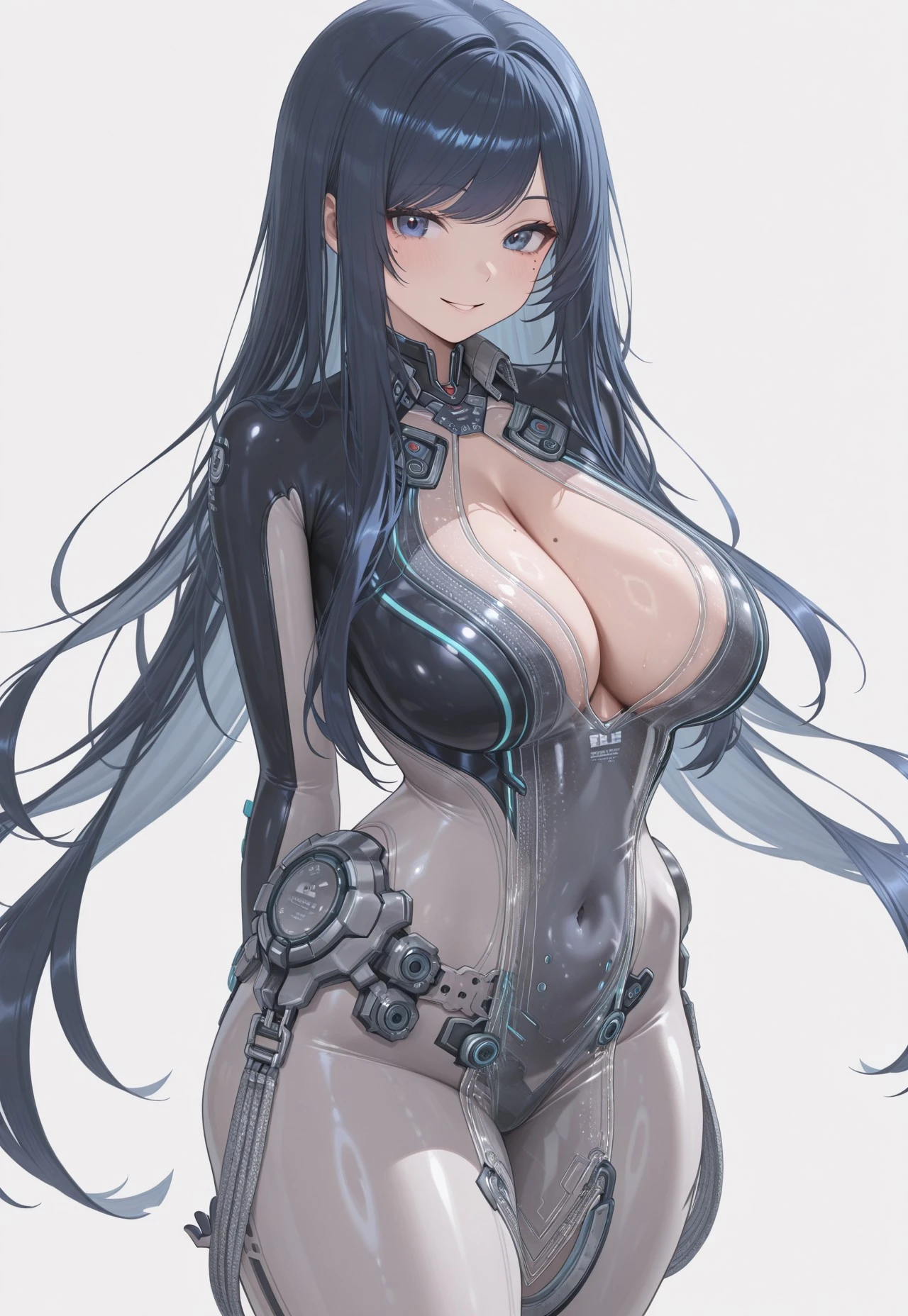 Raven_(Nikke), blue eyes, blue hair, long hair, swept bangs, mole under eye, large breastsOutfit: