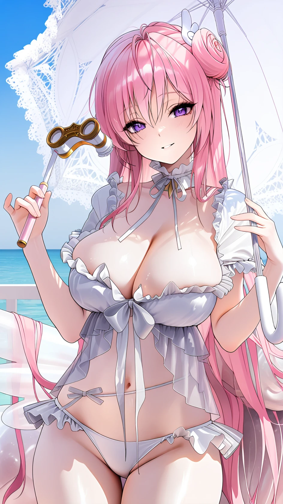 Example prompt : long hair, breasts, bangs, large breasts, cleavage, purple eyes, pink hair, white bikini, frilled bikini, hair bun, short sleeves, frills, white footwear, frilled panties