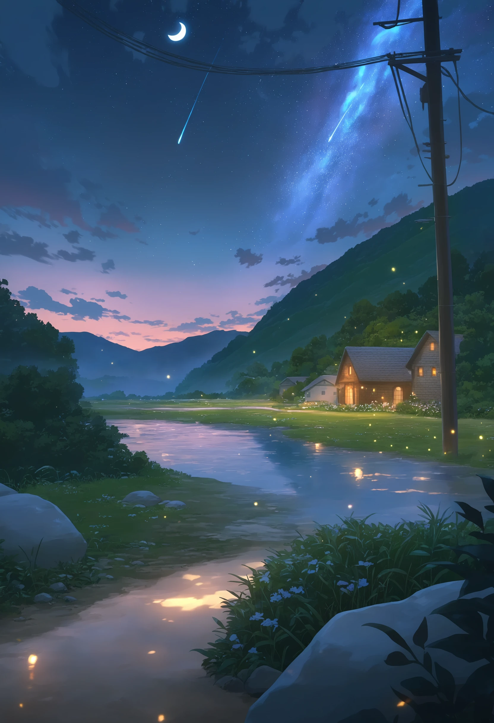 sky, scenery, no humans, cloud, tree, outdoors, night, night sky, star \(sky\), signature, starry sky, anime screencap