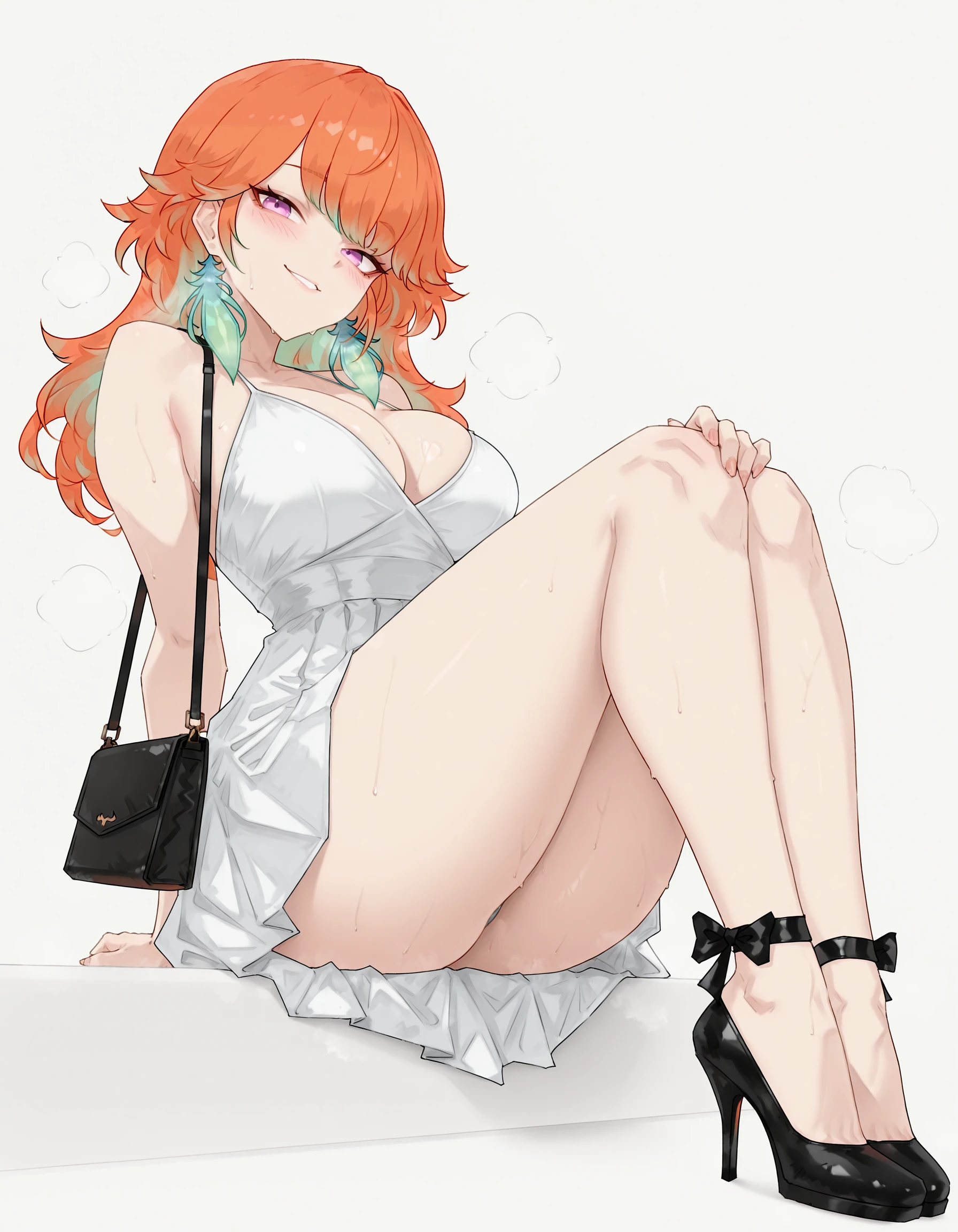 white sundress, pleated dress, short dress, spaghetti strap, cleavage, sleeveless,