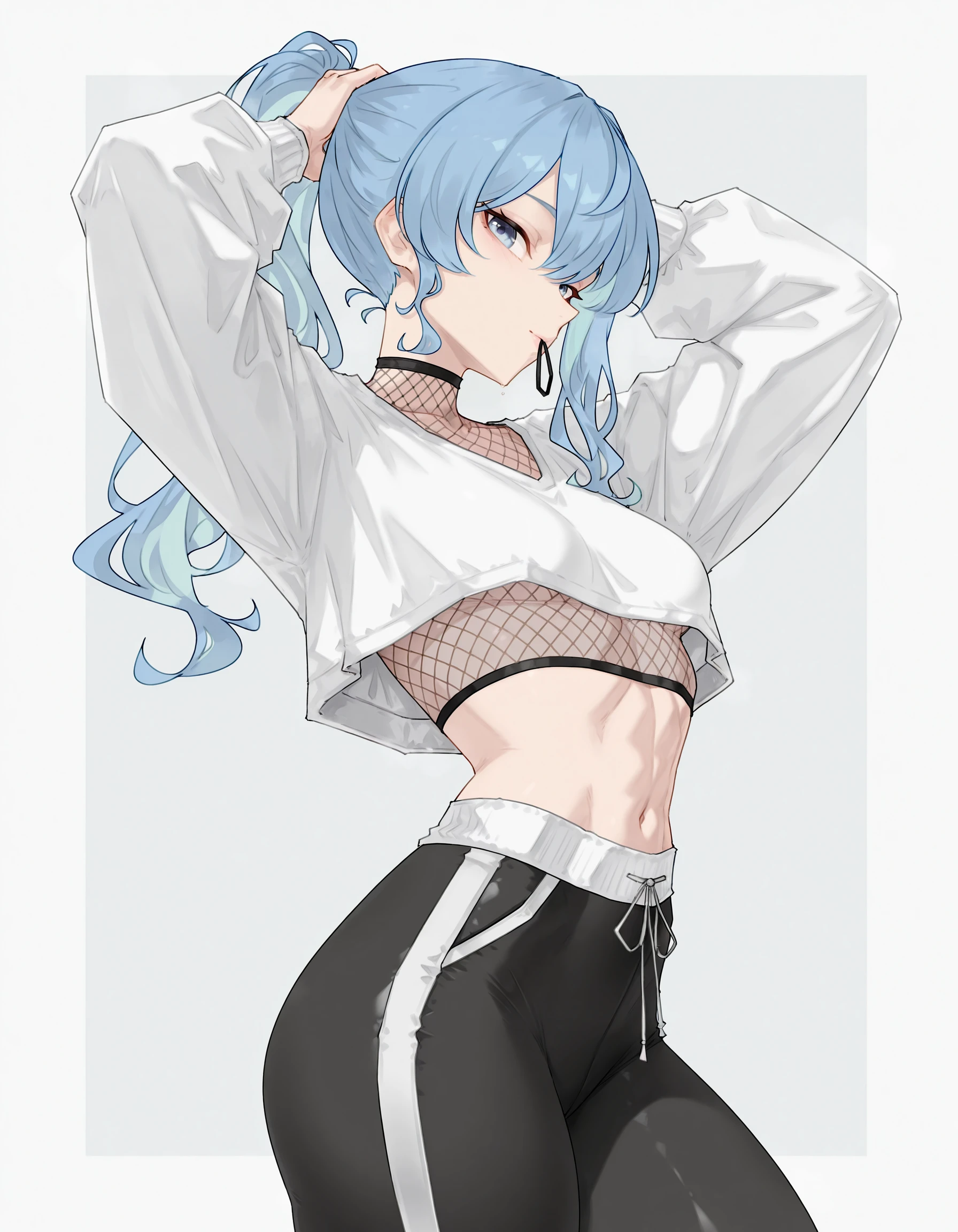 Suisei: hoshimachi suisei, blue eyes, symbol in eye, star in eye, high side ponytail, light blue hair, medium hair, sidelocks, blue hair ribbon, striped ribbon, small breasts, skinny,