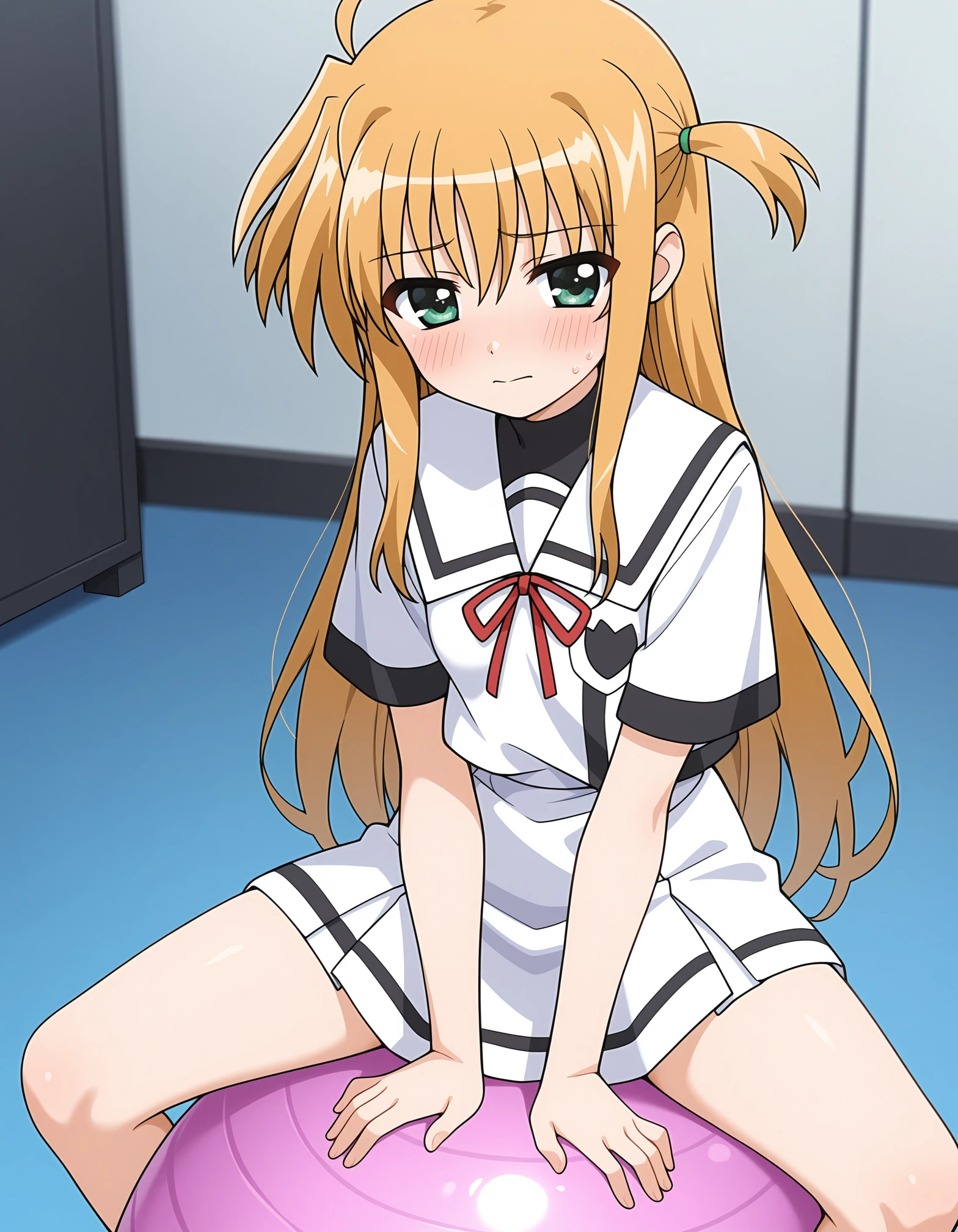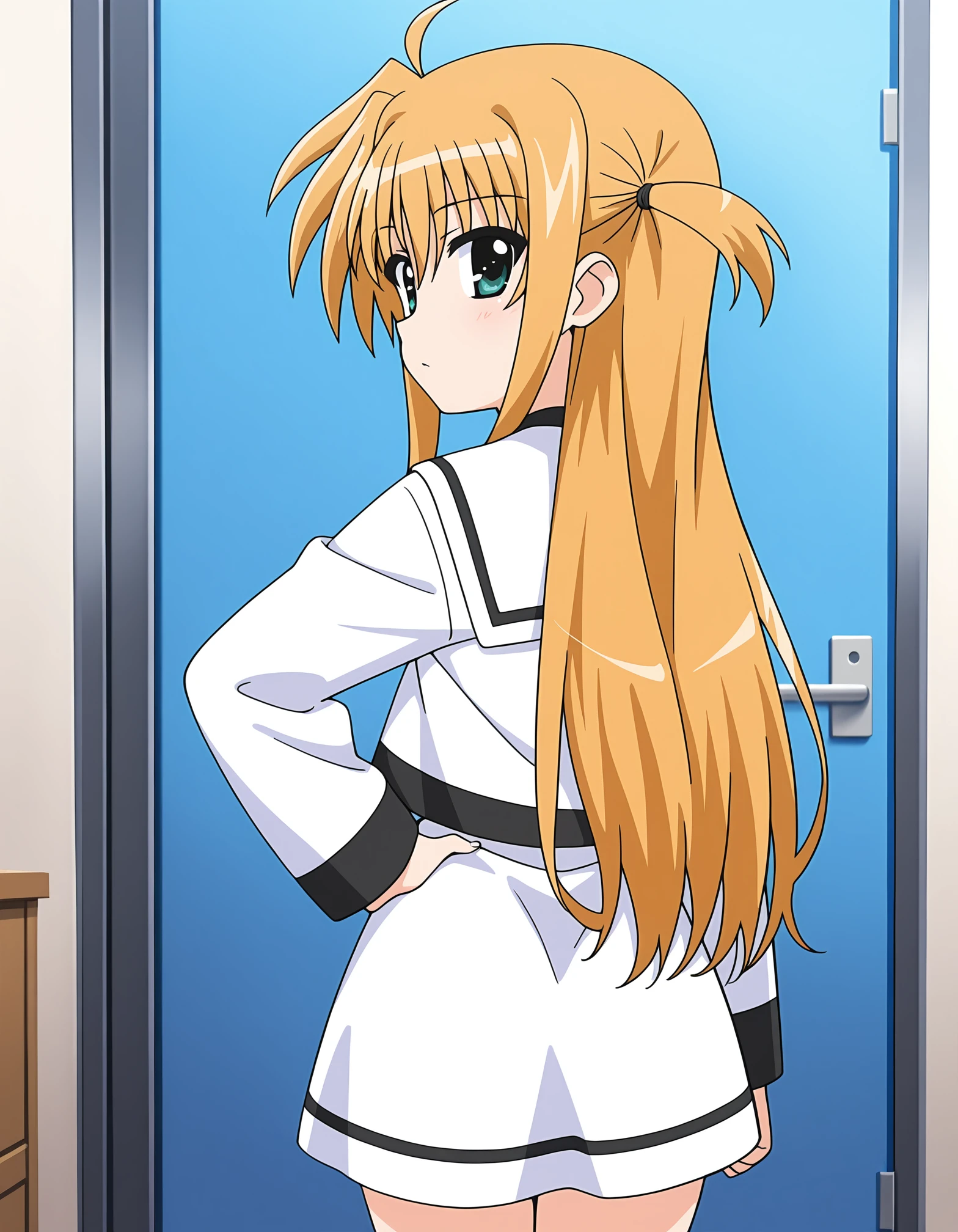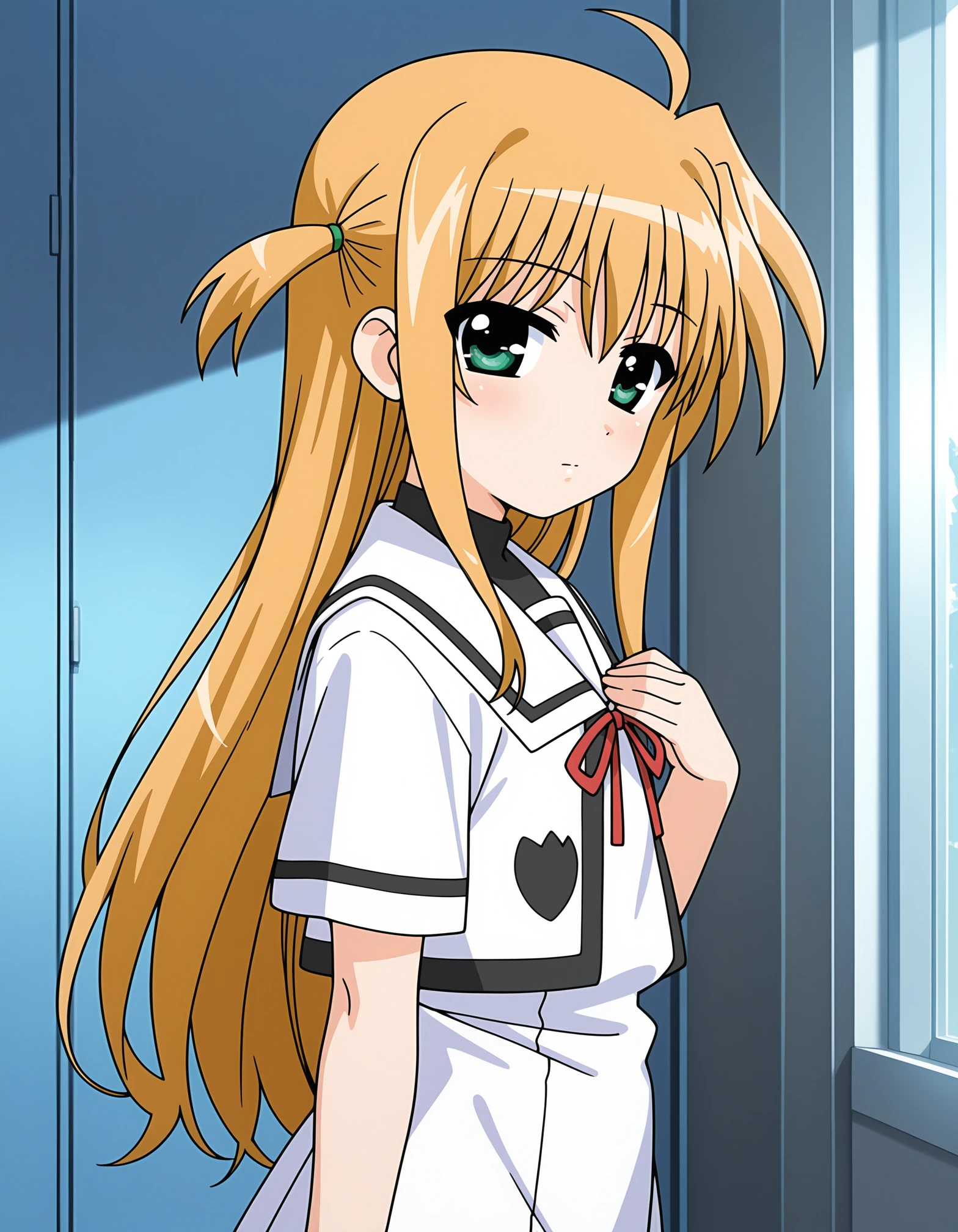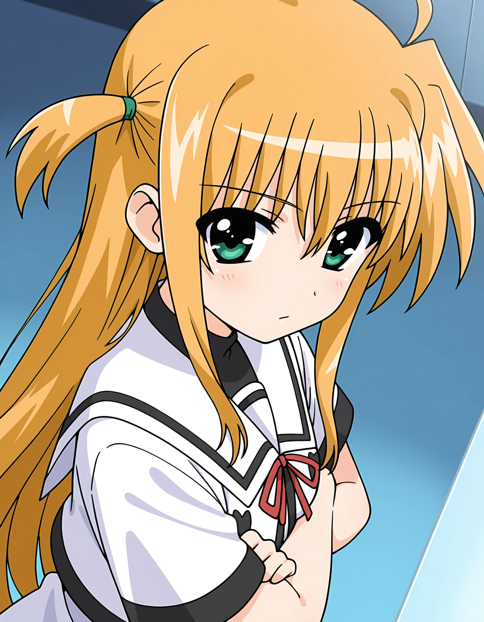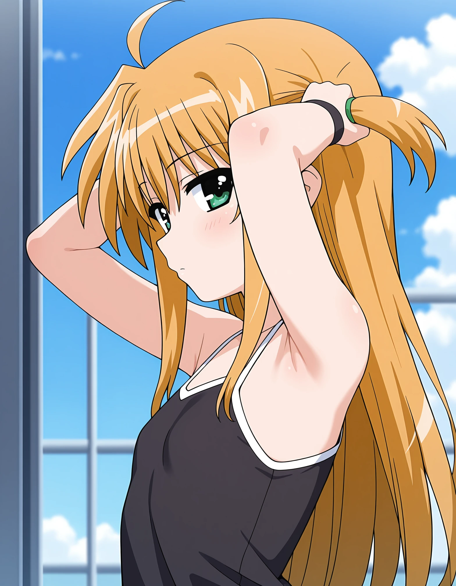 lyrical nanoha,arisa bunnings,blonde hair,long hair,bangs,sidelocks,two side up,ahoge,green eyes,small breasts