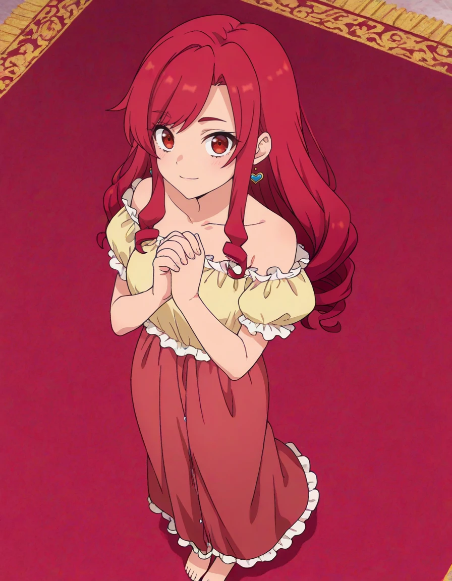 alternate hairstyle, straight hair, sleepwear, yellow off-shoulder shirt, frills, puffy sleeves, short sleeves, red skirt, long skirt