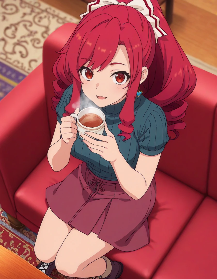 white hair ribbon, curled ends, casual outfit, teal turtleneck sweater, short sleeves, red skirt, lace-up footwear