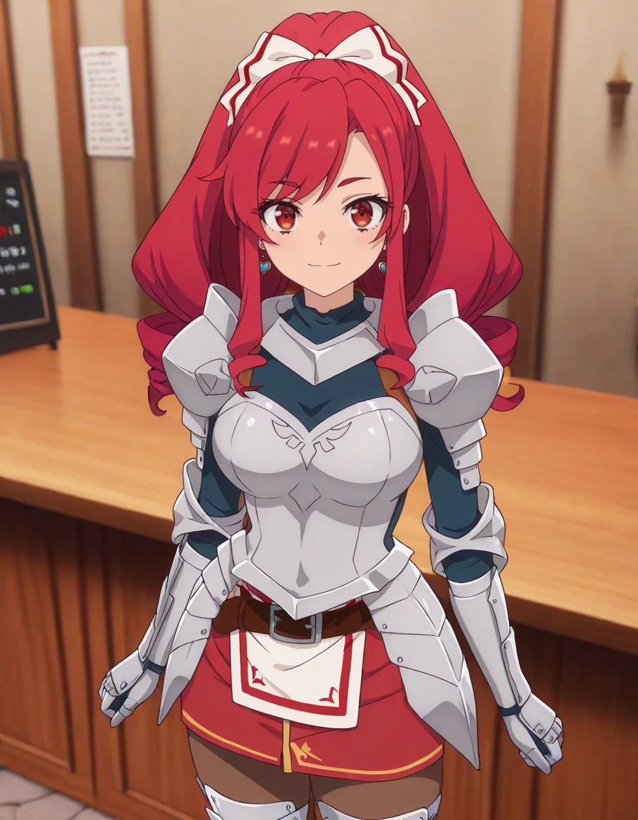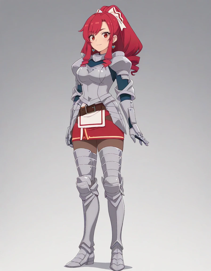 white hair ribbon, curled ends, adventurer outfit 1, armor, blue bodysuit, breastplate, shoulder armor, gauntlets, faulds, belt, (white apron:0.6), red miniskirt, brown pantyhose, greaves, armored boots