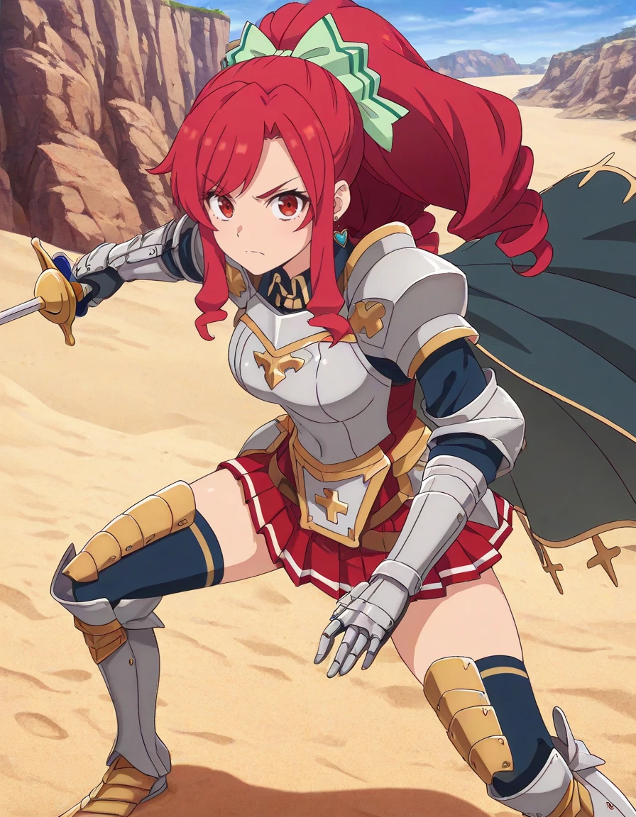 white hair ribbon, green ribbon, curled ends, adventurer outfit 2, armor, blue collared shirt, cape, breastplate, shoulder armor, gauntlets, faulds, cross, red pleated skirt, blue thighhighs, greaves, armored boots